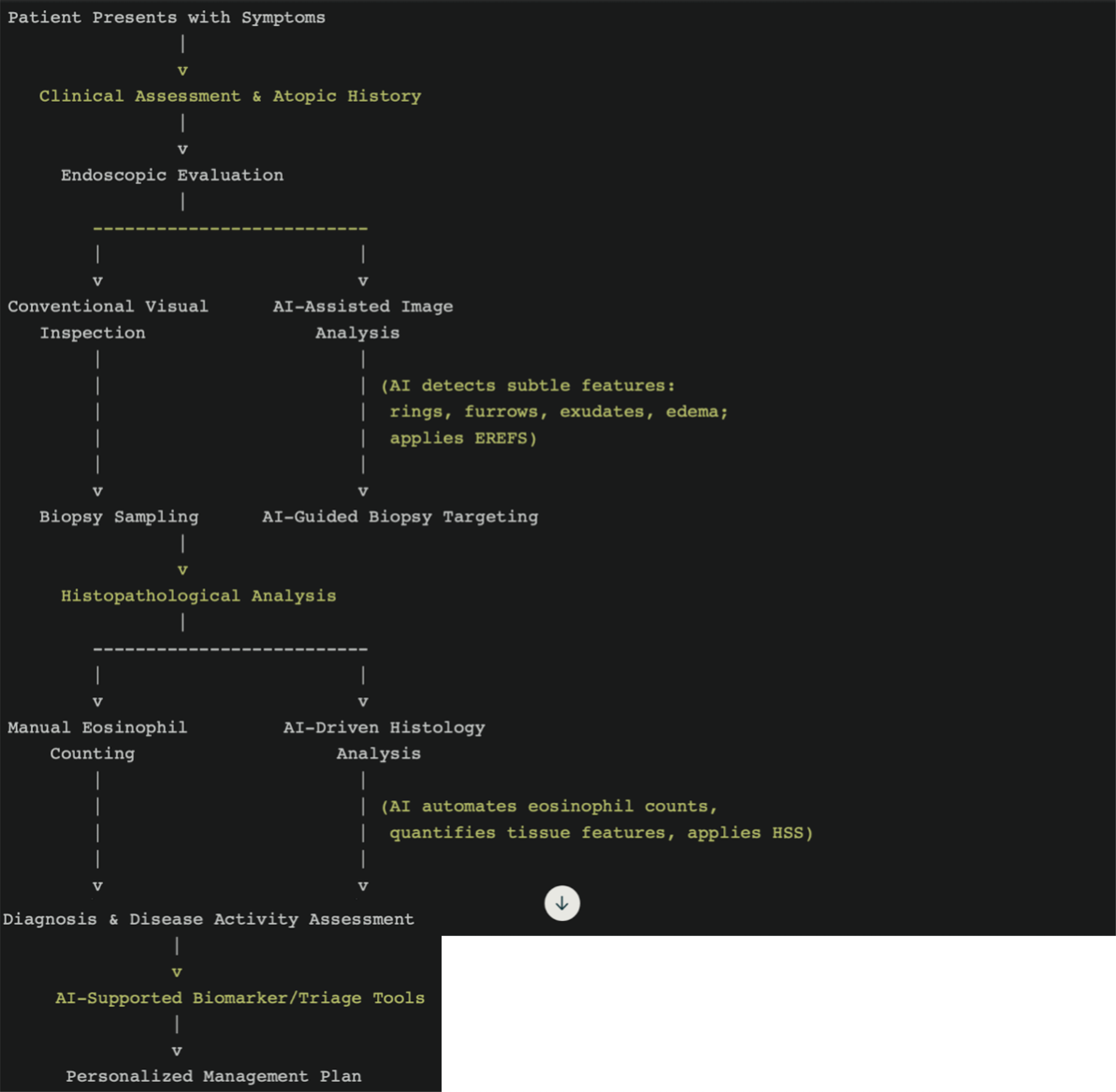 Artificial intelligence (AI) augments the traditional workflow at multiple stages: (1) During endoscopic evaluation, AI models assist in real-time image analysis, enhancing detection of subtle mucosal features and standardizing scoring (e.g., eosinophilic esophagitis endoscopic reference score), and can guide targeted biopsy sampling; (2) In histopathology, AI automates eosinophil counts and evaluates global tissue features, reducing inter-observer variability and expediting diagnosis; and (3) AI-driven biomarker analysis and triage tools (using blood, urine, or non-invasive devices) further support risk stratification and may reduce the need for invasive procedures. These integrations aim to increase diagnostic accuracy, efficiency, and consistency, ultimately supporting more timely and individualized patient management. AI: Artificial intelligence; EREFS: Eosinophilic esophagitis endoscopic reference score; HSS: Histologic scoring system.