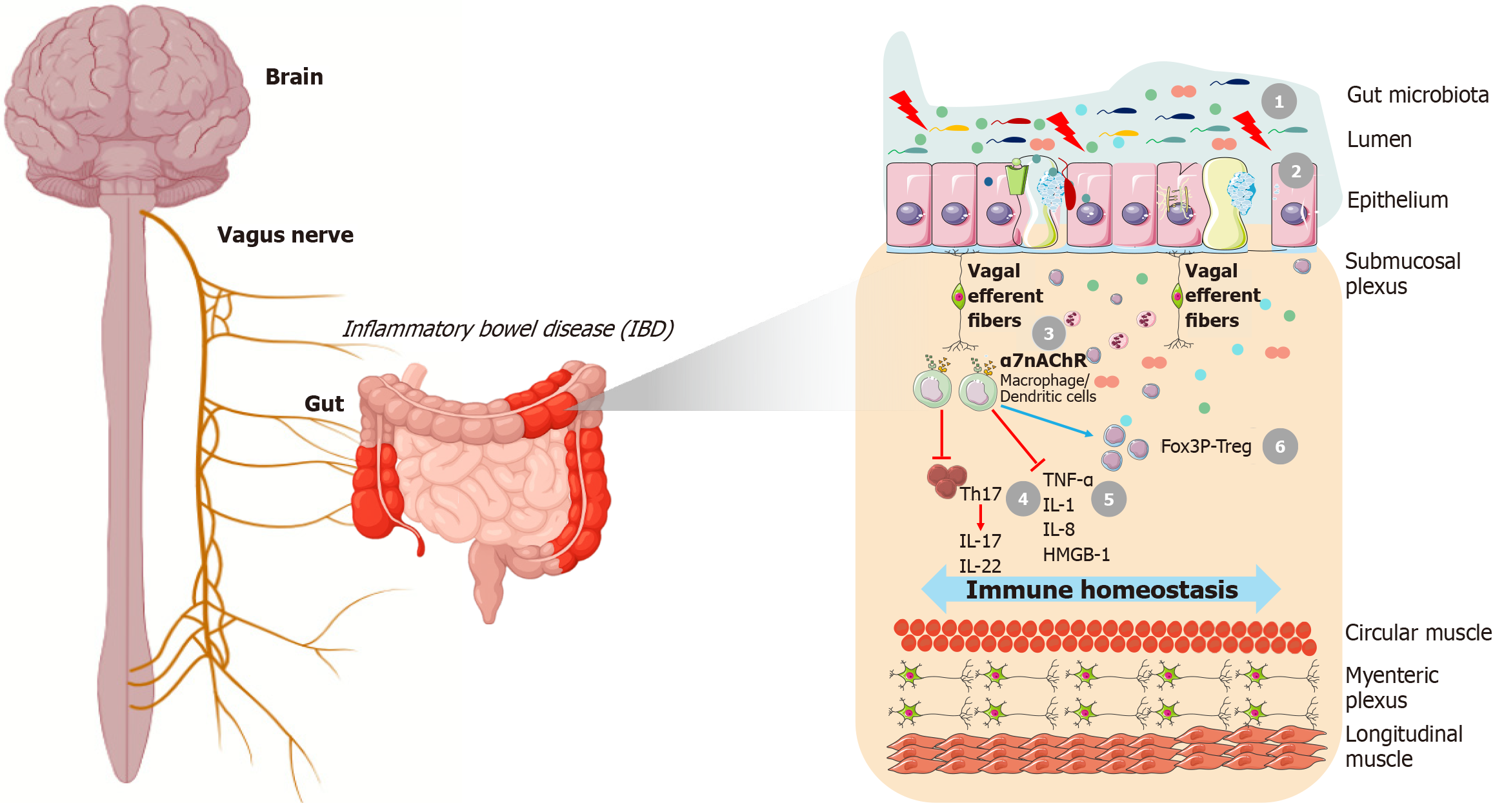 On the left, the anatomical connection between the brain, vagus nerve, and gastrointestinal tract is shown. The enlarged section on the right illustrates an inflamed intestinal mucosa, characterized by microbiota dysbiosis (1), disruption of the epithelial barrier, and immune cell infiltration (2). Vagal efferent fibers release acetylcholine, which binds to the alpha-7 nicotinic acetylcholine receptor expressed on macrophages and dendritic cells (3). This binding suppresses the differentiation of T helper 17 cells (pro-inflammatory helper T lymphocytes) that produce interleukin (IL)-17 and IL-22 (4), inhibits the release of pro-inflammatory cytokines (tumor necrosis factor α, IL-1, IL-8, high mobility group box 1) (5), while promoting the expansion of forkhead box protein 3+ regulatory T cells (6), contributing to immune homeostasis. α7nAChR: Alpha-7 nicotinic acetylcholine receptor; Th17: T helper 17 cells; FoxP3+ Treg: Regulatory T cells expressing the transcription factor forkhead box protein 3; TNF-α: Tumor necrosis factor α; IL-1: Interleukin-1; IL-8: Interleukin-8; HMGB-1: High mobility group box 1; IL-17: Interleukin-17; IL-22: Interleukin-22.