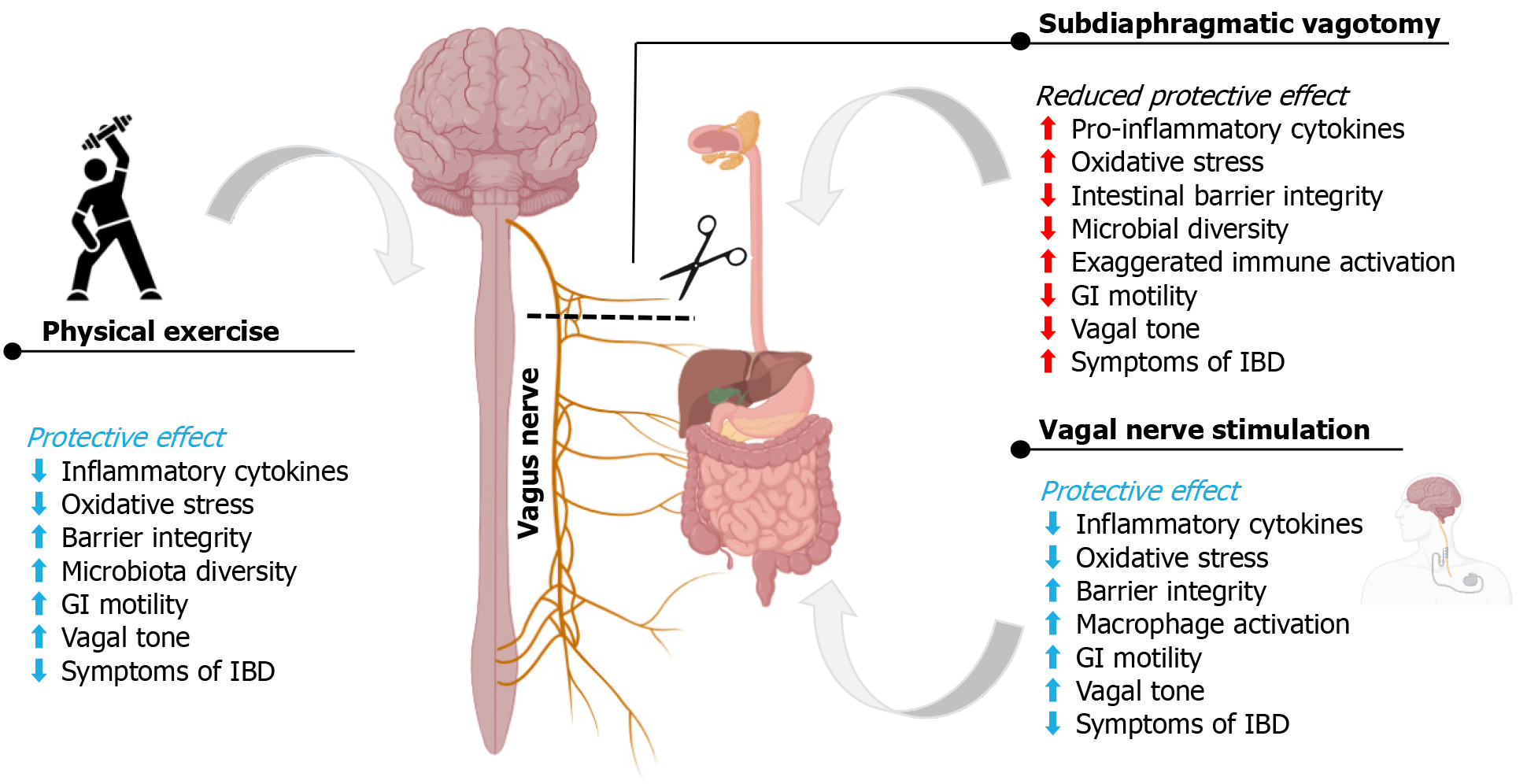 Physical exercise and vagus nerve stimulation promote protective effects through increased vagal tone and activation of the cholinergic anti-inflammatory pathway. In contrast, vagotomy disrupts this pathway, leading to reduced protective effects and potential exacerbation of intestinal inflammation. IBD: Inflammatory bowel disease; GI: Gastrointestinal.