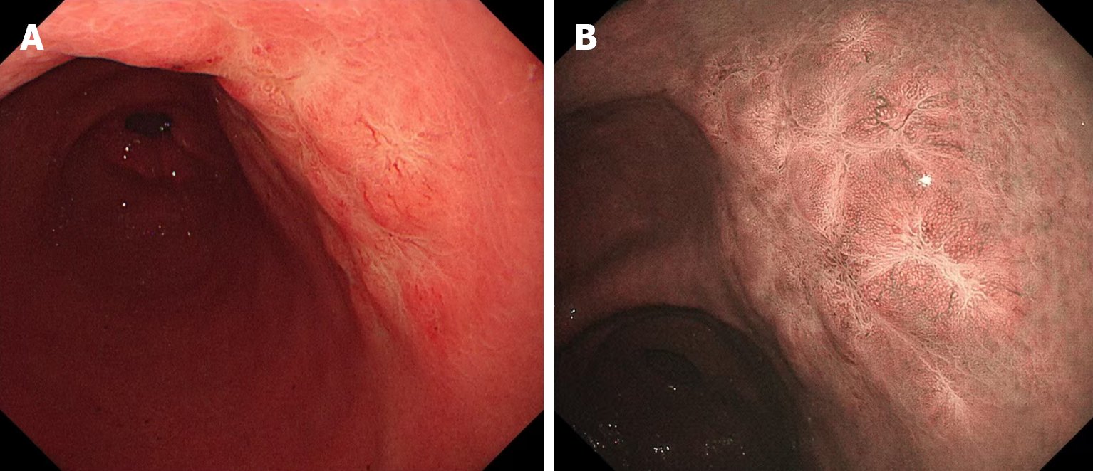 A: Gastroscopy revealed a mucosal rough area measuring 2.5 cm × 3.0 cm in the posterior wall of the antrum; B: Narrow band imaging showed irregular marginal crypt epithelium and subepithelial capillary network.