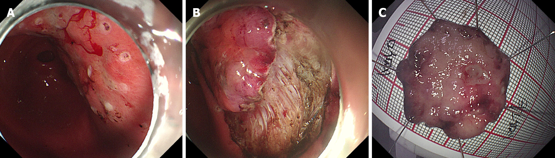 A and B: The procedure of endoscopic submucosal dissection; C: Surgical resection of gross specimens.