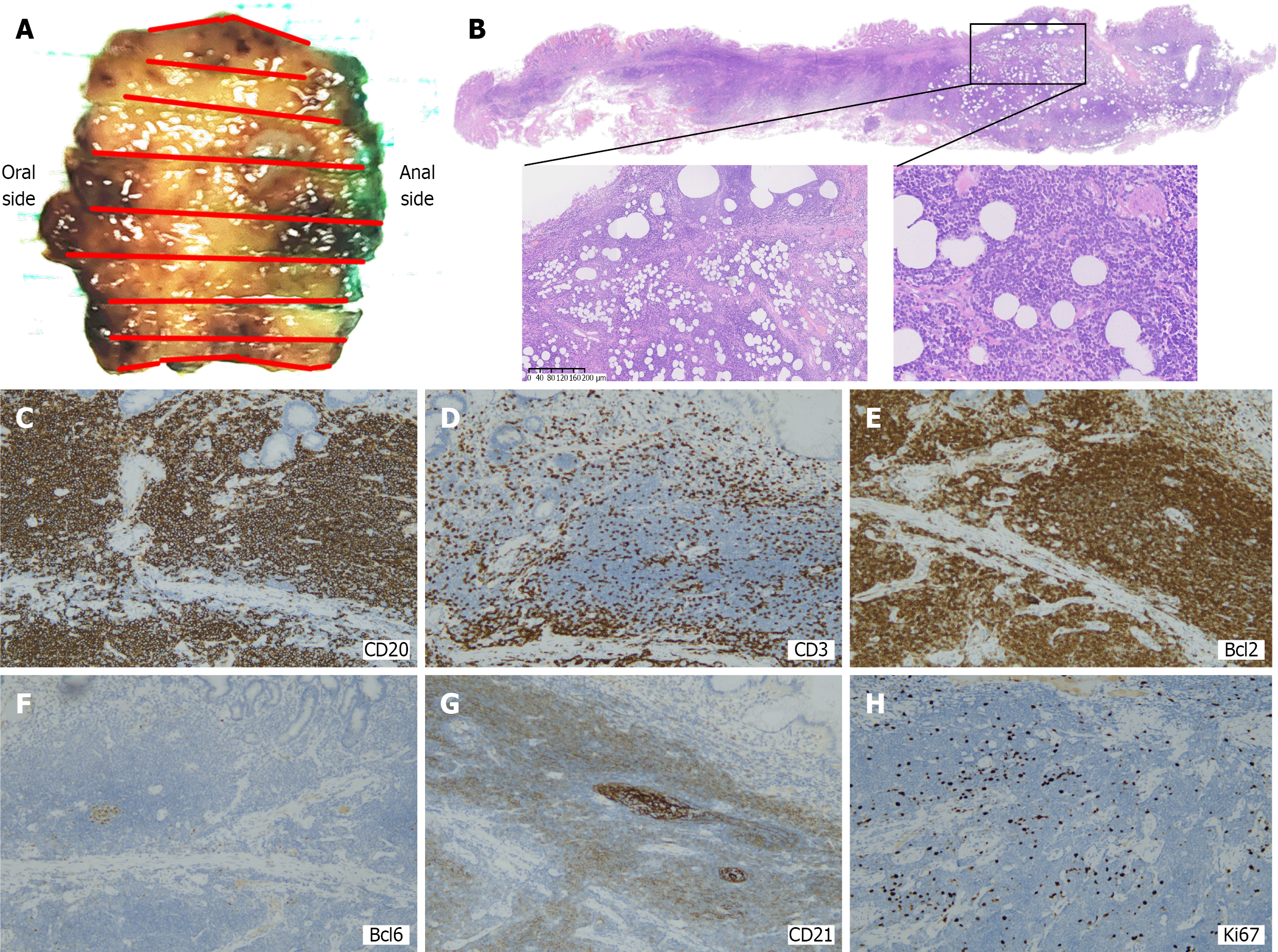 A: Surgical resection of gross specimens; B-H: Postoperative histological examination of the resected specimen revealed dysmorphic lymphoid cells infiltrating the mucosa. Immunohistochemical staining showed positivity for cluster of differentiation (CD) 20, CD3, and Bcl-2, but negativity for CD10 (not shown), Bcl-6, and cyclin D1 (not shown). The Ki-67 index was 5%, suggesting low proliferation. CD: Cluster of differentiation.