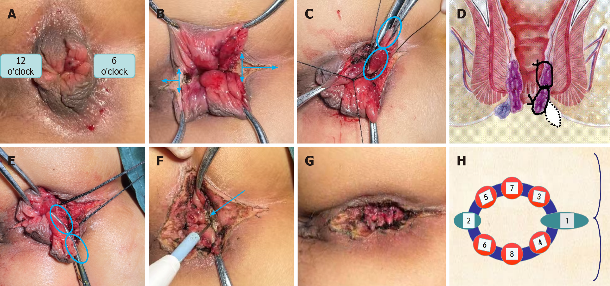 A: Preoperative images showing circumferentially prolapsed hemorrhoids accompanied by skin tags; B: Horizontal incision: Transverse incision of the hemorrhoid at the 6 o’clock and 12 o’clock positions, forming a horizontal “I” shape in the front and rear of the anal region; C-E: Longitudinal ligation: A vertical ligation was conducted along the anal canal, incorporating multiple ligation points that pass through the “8” knot to relieve pressure; F: Degree of anal release: At the conclusion of the surgery, the focus is on both internal and external release at the horizontal incision site located at 6 o’clock; G and H: Postoperative images: Following the complete removal of circumferential hemorrhoids, multiple ligation points are visible, arranged in a staggered pattern that maintains balanced tension. The blue arrows and circles indicate the direction of the surgical incision.