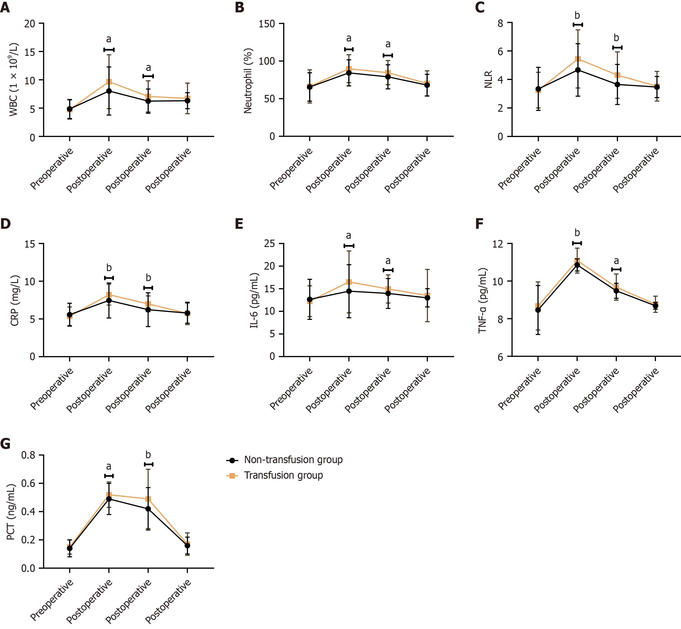 A: White blood cell count; B: Neutrophil; C: Neutrophil/Lymphocyte ratio; D: C-reactive protein; E: Interleukin-6; F: Tumor necrosis factor-alpha; G: Procalcitonin. aP < 0.05. bP < 0.01. WBC: White blood cell count; NLR: Neutrophil/Lymphocyte ratio; CRP: C-reactive protein; IL-6: Interleukin-6; TNF-α: Tumor necrosis factor-alpha; PCT: Procalcitonin.