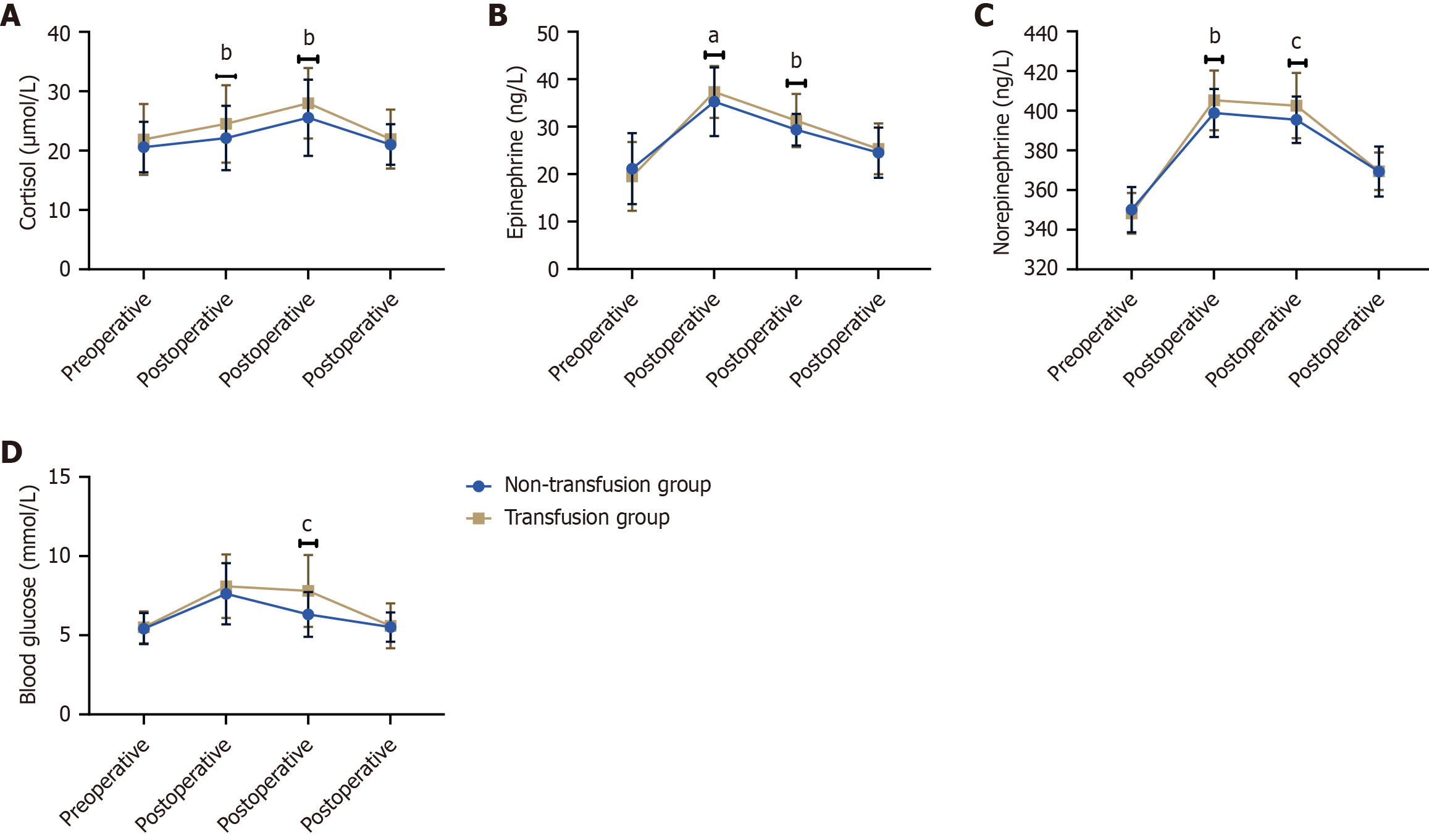 A: Cortisol; B: Epinephrine; C: Norepinephrine; D: Blood glucose. aP < 0.05. bP < 0.01. cP < 0.001.