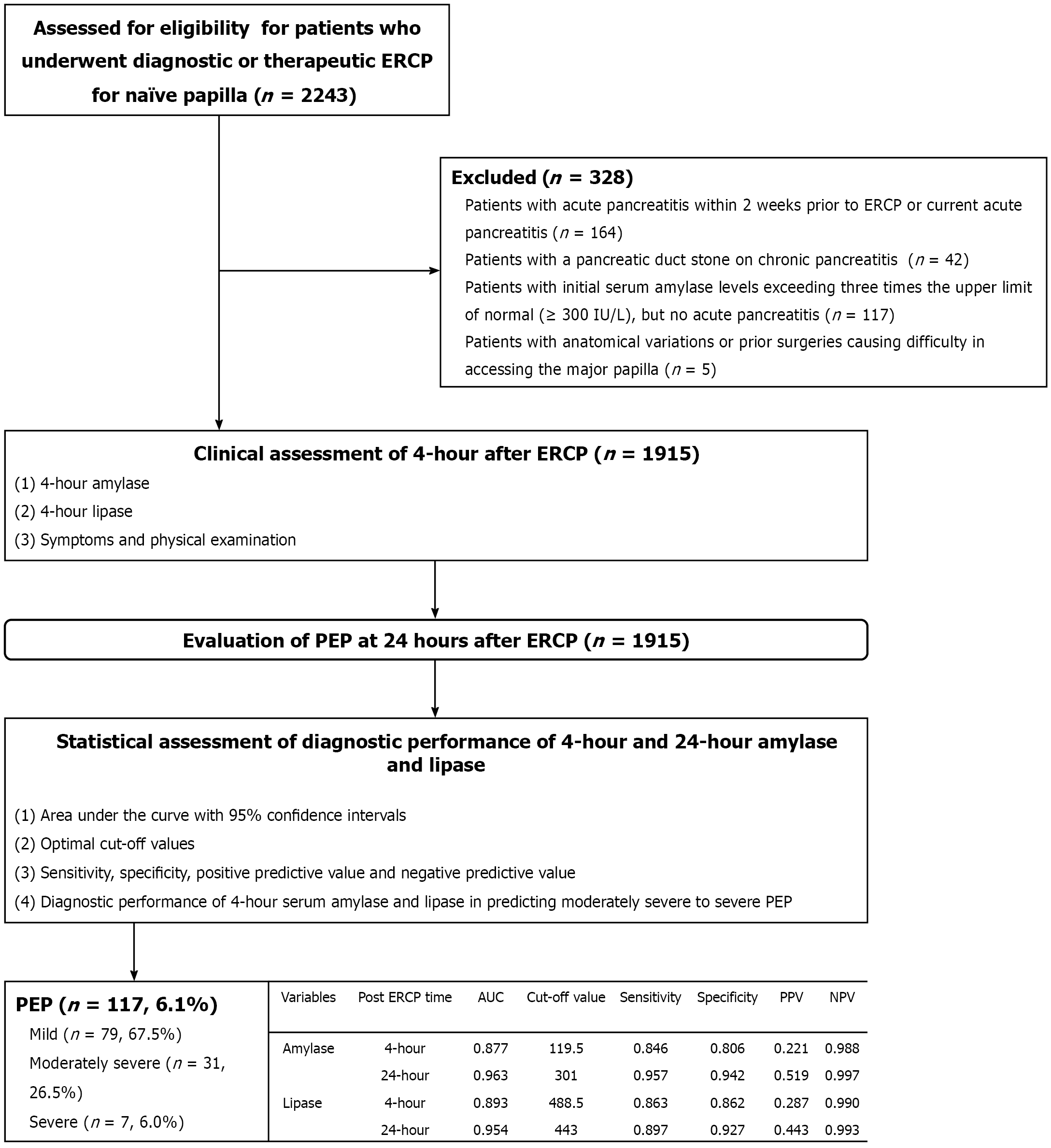 ERCP: Endoscopic retrograde cholangiopancreatography; PEP: Post-endoscopic retrograde cholangiopancreatography pancreatitis; AUC: Area under the curve; PPV: Positive predictive value; NPV: Negative predictive value.