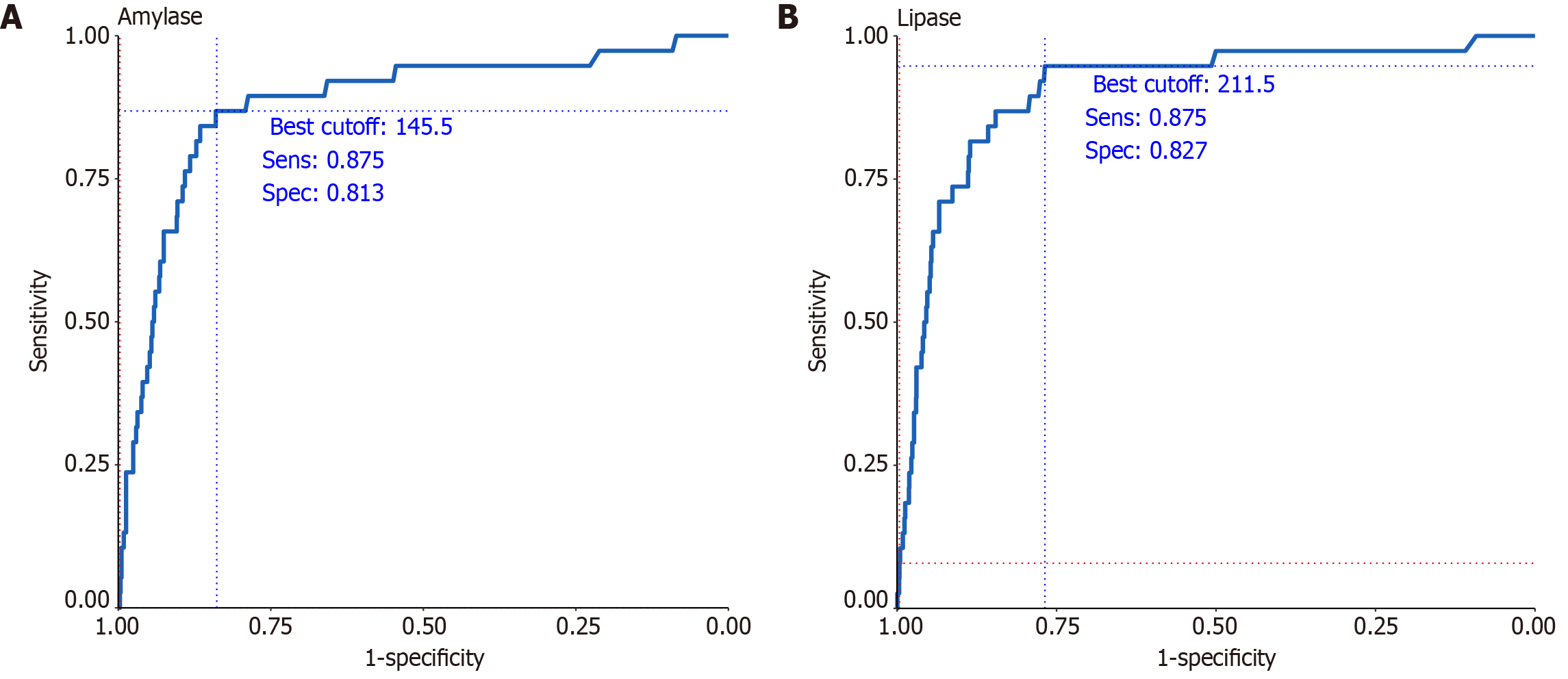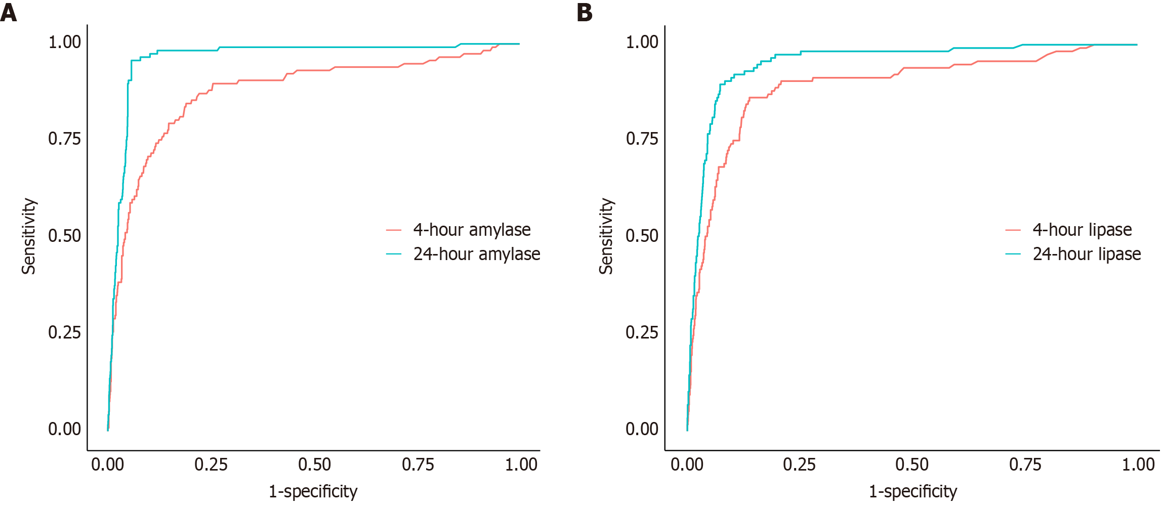 A: Comparison of receiver operating characteristic curves for 4-hour and 24-hour amylase levels in predicting post-endoscopic retrograde cholangiopancreatography pancreatitis; B: Comparison of receiver operating characteristic curves for 4-hour and 24-hour lipase levels in predicting post-endoscopic retrograde cholangiopancreatography pancreatitis receiver operating characteristic, receiver operating characteristic.