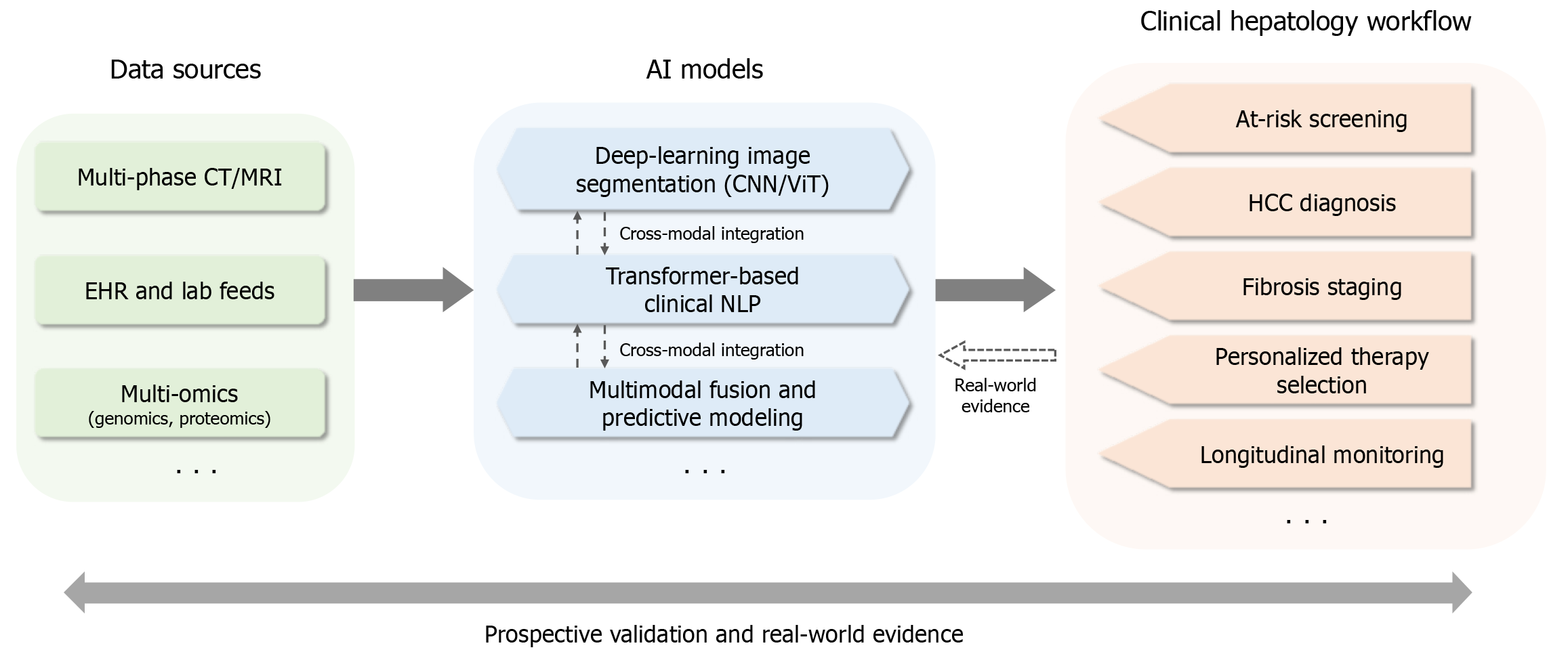 Figure 1 A conceptual framework showing the interaction between artificial intelligence models and clinical workflows in hepatology.