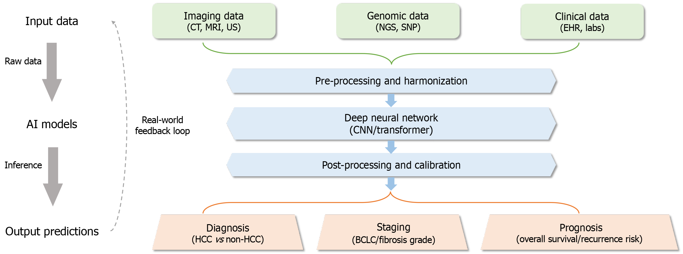 Data preprocessing step includes radiomics, natural language processing and data integration. Feature extraction step includes convolutional neural network and machine learning algorithms. Prediction step includes classification, forecasting and assessment. Feedback step contents issuing early warnings, providing real-time decision support, enabling personalized treatment plans, providing objective evidence and non-invasive, efficient tools for clinical decision-making. AI: Artificial intelligence; CT: Computerized tomography; MRI: Magnetic resonance imaging; US: Ultrasonography; NGS: Next-generation sequencing; SNP: Single nucleotide polymorphism; EHR: Electronic health records; CNN: Convolutional neural network; HCC: Hepatocellular carcinoma; BCLC: Barcelona Clinic Liver Cancer.