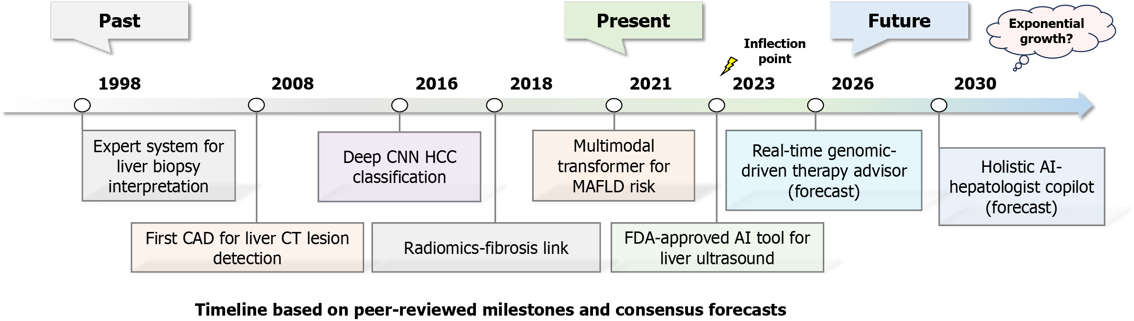 Figure 3 A timeline outlining historical evolution and future projections of artificial intelligence in liver medicine.