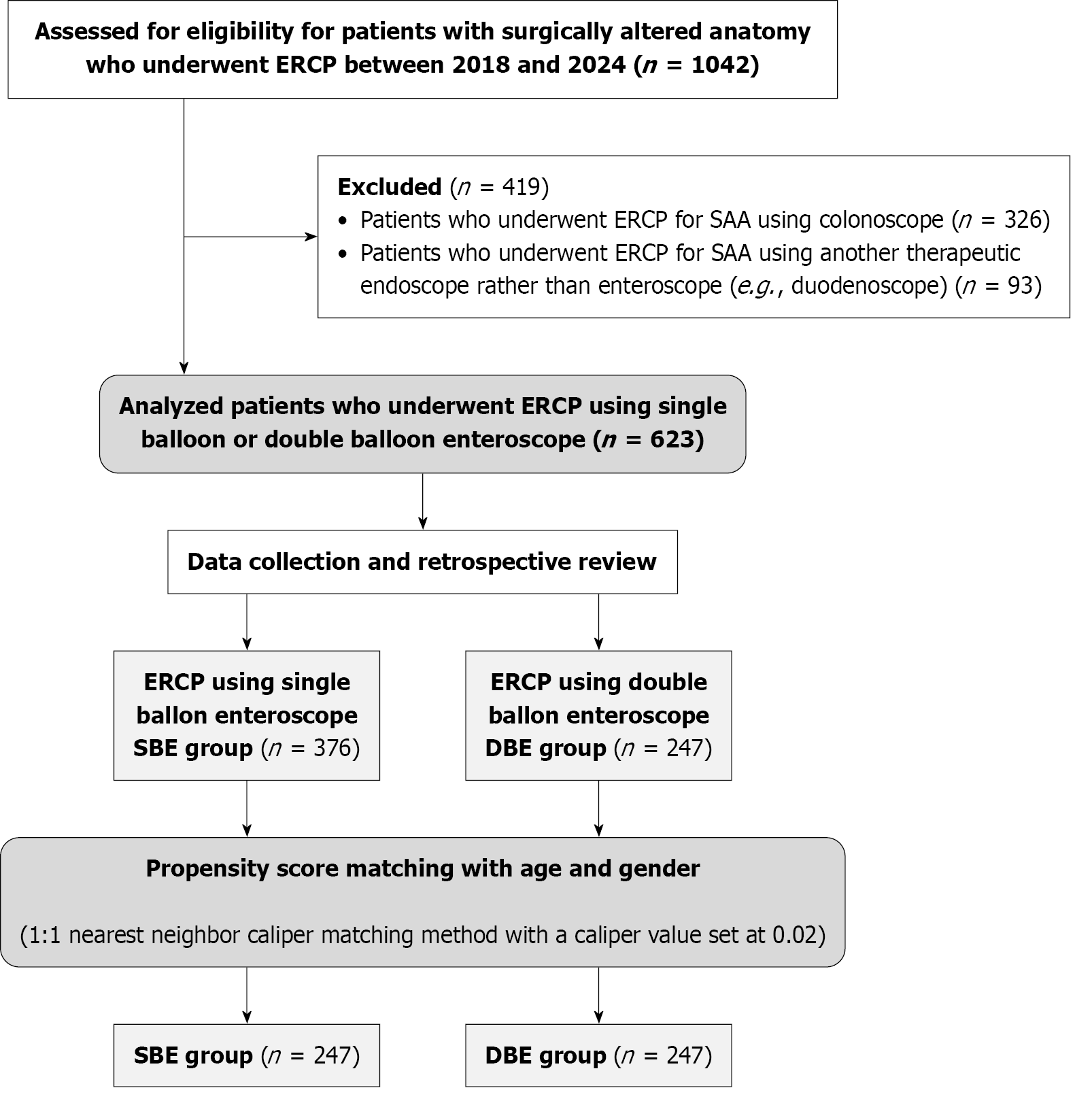 ERCP: Endoscopic retrograde cholangiopancreatography; SAA: Surgically altered anatomy; SBE: Single-balloon enteroscopy; DBE: Double-balloon enteroscopy.