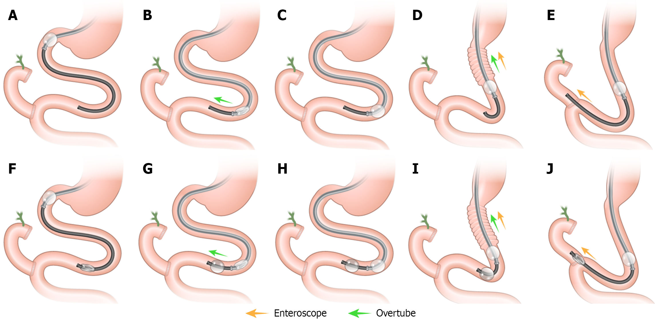 A-E: Using single-balloon; F-J: Using double-balloon enteroscope.