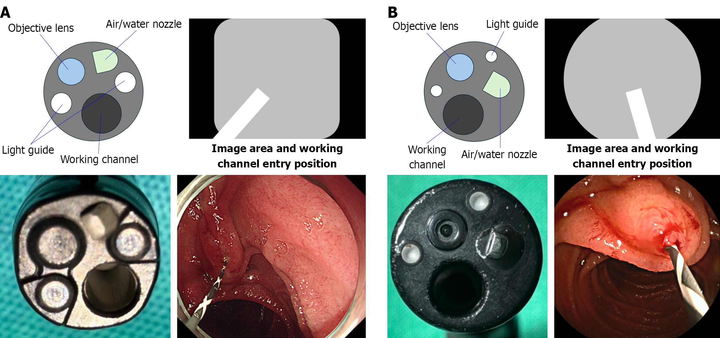 A: In the single-balloon enteroscope, the working channel is oriented toward the 8 o’clock position, which aligns favorably with the bile duct axis in patients with a native papilla; B: In contrast, the double-balloon enteroscope features a working channel positioned at approximately the 5:30 direction, requiring papillary repositioning for optimal cannulation. The orientation of the working channel, which differs between the two enteroscope types, may significantly impact the technical ease and approach required for biliary cannulation based on the anatomical configuration.
