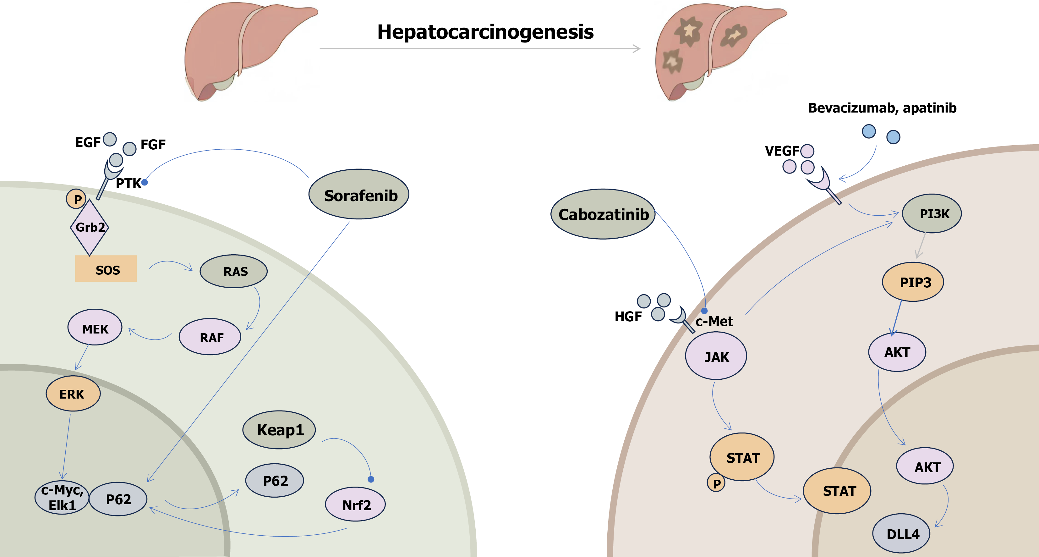 Sorafenib inhibits the expression of c-Myc and ETS transcription factor 1 through multiple rapidly accelerated fibrosarcoma/mitogen-activated protein kinase kinase/extracellular signal-regulated kinase signaling pathways, including the Janus kinase/signal transducer and activator of the transcription pathway, while promoting the expression of pro-death markers like P62. Cabozantinib exerts its anti-liver cancer effects primarily through the phosphatidylinositol 3-kinase/phosphatidylinositol-(3,4)-P2/protein kinase B pathway. Additionally, bevacizumab and apatinib target liver cancer by inhibiting key downstream signaling molecules in the phosphatidylinositol 3-kinase/phosphatidylinositol-(3,4)-P2/protein kinase B pathway, thereby modulating the cellular response to these anti-tumor therapies. These findings underscore the importance of understanding the molecular mechanisms of drug action in the development of more effective liver cancer treatments. EGF: Epidermal growth factor; FGF: Fibroblast growth factor; PTK: Protein tyrosine kinases; RAF: Rapidly accelerated fibrosarcoma; MEK: Mitogen-activated protein kinase kinase; ERK: Extracellular signal-regulated kinase; Elk1: ETS transcription factor 1; Keap1: Kelch-like ECH-associated protein 1; Nrf2: Nuclear factor erythroid 2-related factor 2; VEGF: Vascular endothelial growth factor; PI3K: Phosphatidylinositol 3-kinase; PIP3: Phosphatidylinositol-(3,4,5)-P3; HGF: Hepatocyte growth factor; AKT: Protein kinase B; STAT: Signal transducer and activator of the transcription; DLL4: Delta-like ligand 4.