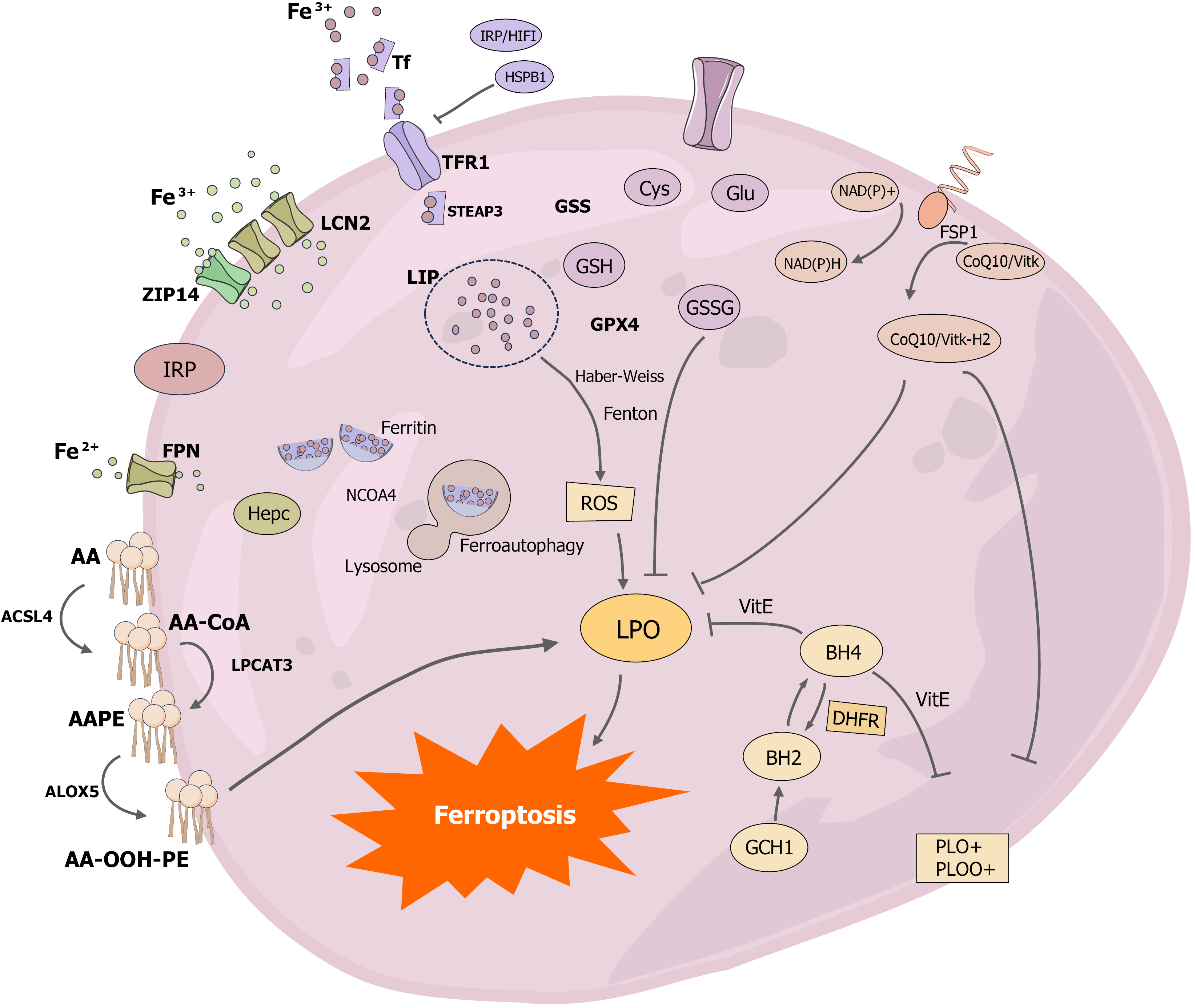 The key molecular mechanisms of ferroptosis have been systematically investigated, with a focus on understanding the pathways and mechanisms of iron-related processes. Ferritin, the primary storage protein for iron in the body, plays a central role in iron metabolism. Iron is primarily acquired in the bloodstream as Fe3+, which enters cells through the transferrin receptor 1 (TFR1) on the cell surface. The expression of TFR1 is regulated by iron regulatory protein and hypoxia-inducible factor-1, while heat shock protein B1 inhibits TFR1 expression. Fe3+ is reduced to Fe2+ by the lipid carrier protein 2, which allows free iron to enter the cytoplasmic iron-unstable pools. Additionally, ZRT/IRT-like proteins such as ZRT/IRT-like protein 14 can also mediate iron entry into the cell. Ferritin, the sole channel protein for Fe2+ export, is primarily regulated by hemosiderin, and ferritin autophagy is a critical mechanism for maintaining intracellular free Fe2+ levels. When autophagy receptor nuclear coactivator 4 is present, ferritin binds to autophagosomes, increasing intracellular free Fe2+ levels. Free iron in the cytoplasmic iron-unstable pools generates reactive oxygen species through the Fenton reaction and Haber-Weiss reaction. Enzymatic pathways, such as long-chain family 4 catalyzing arachidonoyl-CoA formation, lysophosphatidylcholine acyltransferase 3 controlling the esterification of arachidonoyl-CoA to arachidonoyl-phosphatidylethanolamine, and arachidonic acid lipoxygenases oxidizing arachidonoyl-phosphatidylethanolamine to AA-OOH-PE, contribute to the generation of reactive oxygen species. The primary antioxidant pathways in ferroptosis include the cystine/glutamate antiporter/glutathione peroxidase 4/glutathione axis, the ferroptosis suppressor protein 1-CoQ10-NAD(P)H axis, and the GTP cyclohydrolase 1-dihydrofolate reductase-BH4 axis. Notably, the ferroptosis suppressor protein 1-CoQ10-NAD(P)H axis and the GTP cyclohydrolase 1-dihydrofolate reductase-BH4 axis function to inhibit fatty acid synthesis, thereby contributing to the oxidative stress response in ferroptosis. Tf: Transferrin; IRP: Iron regulatory protein; HIF1: Hypoxia-inducible factor 1; HSPB1: Heat shock protein B1; TFR1: Transferrin receptor 1; LCN2: Lipid carrier protein 2; GSS: Glutathione synthetase; ZIP14: ZRT/IRT-like protein 14; GSH: Glutathione; GSSG: Glutathione disulfide; FSP1: Ferroptosis suppressor protein 1; GPX4: Glutathione peroxidase 4; FPN: Ferroportin; ROS: Reactive oxygen species; AA: Arachidonic acid; AA-CoA: Arachidonoyl-CoA; AA-PE: Arachidonoyl-phosphatidylethanolamine; ACSL4: Acyl coenzyme A synthetase long-chain family 4; LPCAT3: Lyso-phosphatidylcholine acyltransferase-3; ALOX5: Arachidonic acid lipoxygenases 5; LPO: Lipid peroxidation; DHFR: Dihydrofolate reductase; GCH1: GTP cyclohydrolase 1.