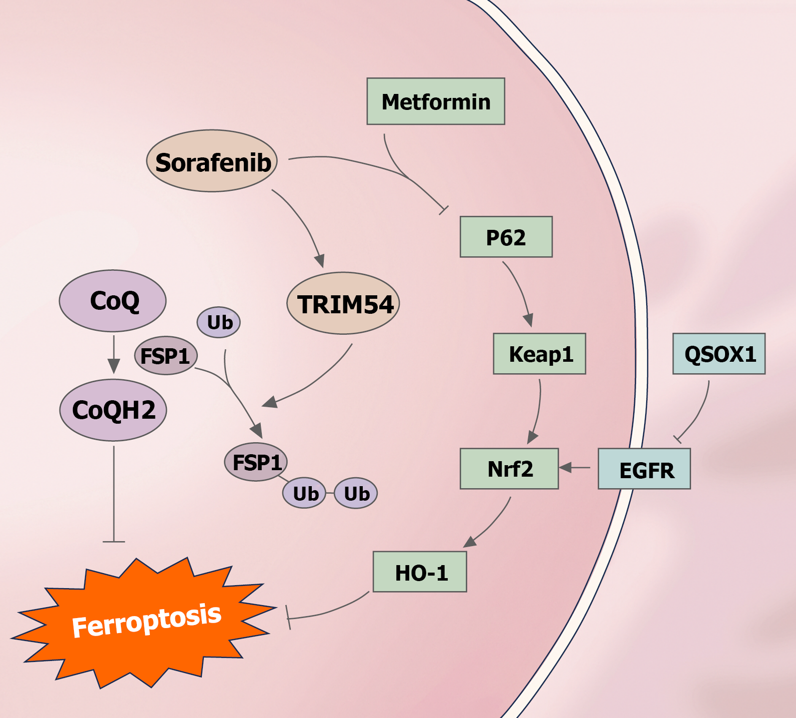 Sorafenib enhances the ubiquitination of ferroptosis suppressor protein 1 through TRIM54, leading to the induction of ferroptosis by decreasing CoQH2. Furthermore, quiescin sulfhydryl oxidase 1 induces ferroptosis by inhibiting epidermal growth factor receptor, which subsequently inhibits nuclear factor erythroid 2-related factor 2. Metformin induces ferroptosis by inhibiting the P62/Kelch-like ECH-associated protein 1/nuclear factor erythroid 2-related factor 2/heme oxygenase 1 pathway. FSP1: Ferroptosis suppressor protein 1; Keap1: Kelch-like ECH-associated protein 1; Nrf2: Nuclear factor erythroid 2-related factor 2; EGFR: Epidermal growth factor receptor; HO-1: Heme oxygenase 1.
