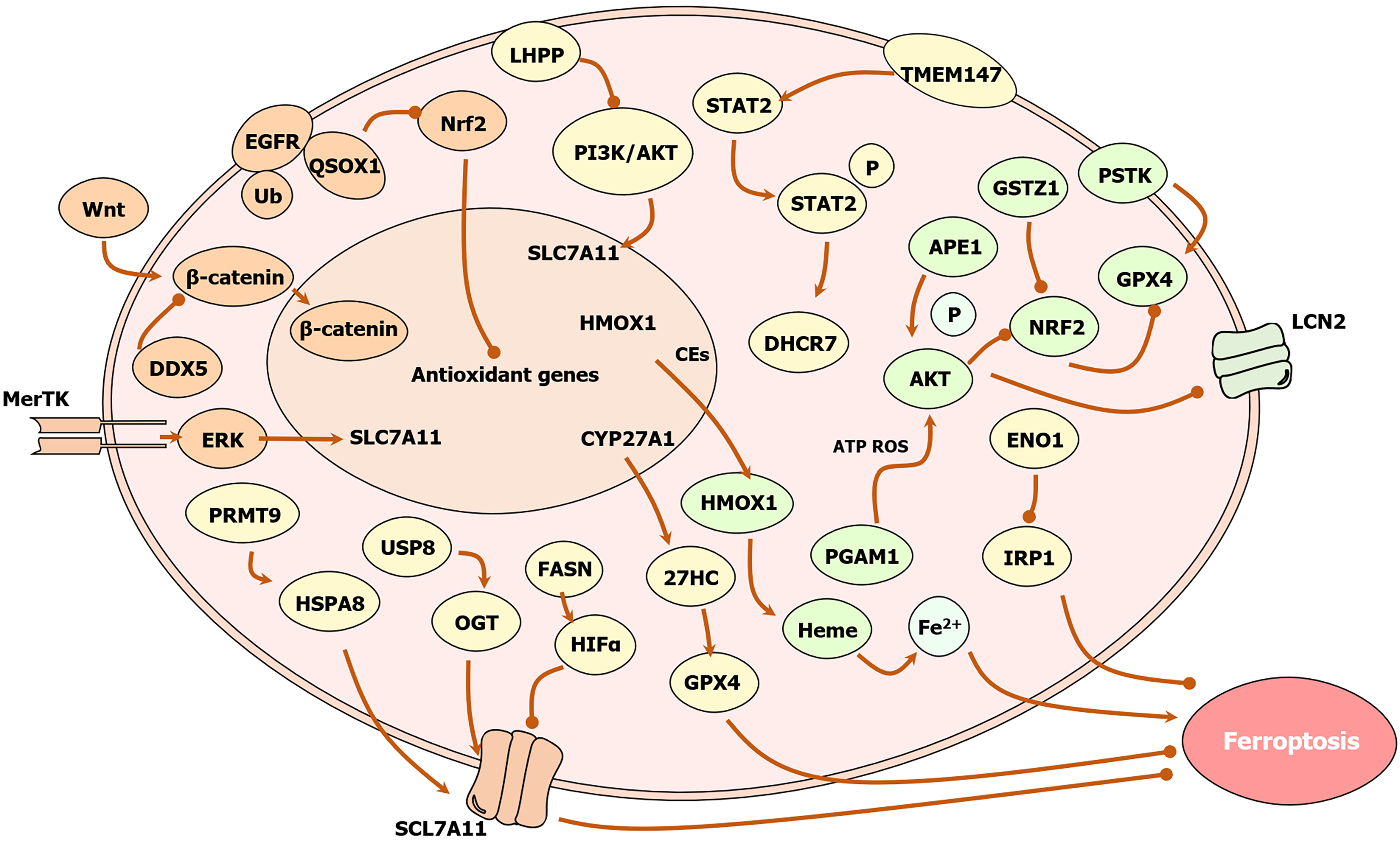Phosphoglycerate mutase 1 inhibits ferroptosis through an energy stress/reactive oxygen species (ROS)-dependent protein kinase B (AKT)/Lipid carrier protein 2 pathway; nicotinamide methyltransferase inhibits ferroptosis via the multifunctional microneedle array/ROS axis; lysine-specific demethylase 4 inhibits ferroptosis via the murine double minute 2/P53/SLC7A11/glutathione peroxidase 4 (GPX4) axis; 7-dehydrocholesterol reductase inhibits ferroptosis through the TMEM147/signal transducer and activator of transcription 2/7-dehydrocholesterol reductase/27HC axis; ubiquitin-specific peptidase 8 (USP8) inhibits ferroptosis through the USP8/O-GlcNAc transferase/SLC7A11 signaling pathway and the Wnt/β-catenin/GPX4 axis; protein arginine methyltransferase 9 inhibits ferroptosis through the hepatitis B virus X protein/protein arginine methyltransferase 9/heat shock protein A8/CD44 axis; α-enolase 1 inhibits ferroptosis through the α-enolase 1-iron regulatory protein 1-Mfrn1 pathway; apurinic/apyrimidinic endonuclease 1 inhibits ferroptosis through the AKT/glycogen synthase kinase-3β/nuclear factor erythroid 2-related factor 2 (Nrf2)/SLC7A11/GPX4 axis; phospho-serine acyl-tRNA kinase inhibits ferroptosis through the thioredoxin reductase/thioredoxin/glutathione/GPX4 pathway; inhibits ferroptosis; dual-specific phosphatase 4 inhibits ferroptosis via the YTHDC1/FTL/ferritin heavy chain 1/Lipid ROS pathway; MER proto-oncogene tyrosine kinase inhibits ferroptosis via the extracellular signal-regulated kinase/SP1/SLC7A11 pathway; ubiquitin C-terminal hydrolase L3 inhibits ferroptosis via the Ub-proteasome/Wnt/β-catenin/GPX4 pathway; aldehyde reductase 1C3 inhibits ferroptosis via the Hippo/YAP/TAZ/SLC7A11 pathway to inhibit ferroptosis; the deubiquitinating enzyme EIF3H inhibits ferroptosis via the O-GlcNAc transferase/Lipid ROS/glutathione pathway; the USP24 promotes ferroptosis via the K48/Beclin1/ferroportin pathway promotes ferroptosis; lysine phosphatase promotes ferroptosis via the lysine phosphatase/phosphatidylinositol-3-kinase/AKT pathway; quiescin sulfhydryl oxidase 1 promotes ferroptosis via the epidermal growth factor receptor/Nrf2/GPX4 pathway; RNA helicase DDX5 promotes ferroptosis via the Wnt/β-catenin/GPX4 signaling pathway to promote ferroptosis; glutathione S-transferase zeta 1 promotes ferroptosis via the Kelch-like ECH-associated protein 1/Nrf2/GPX4 pathway; fatty acid synthase promotes ferroptosis via the fatty acid synthase/hypoxia-inducible factor-1α/SLC7A11 pathway; heme oxygenase 1 promotes ferroptosis through the Nrf2/heme oxygenase 1/GPX4 axis; flavin monooxygenase 3 promotes ferroptosis through the flavin monooxygenase 3/trimethylamine N-oxide/signal transducer and activator of transcription 3/SLC7A11/GPX4 axis. LHPP: Lysine phosphatase; EGFR: Epidermal growth factor receptor; QSOX1: Quiescin sulfhydryl oxidase 1; Nrf2: Nuclear factor erythroid 2-related factor 2; PI3K: Phosphoinositol-3-kinase; AKT: Protein kinase B; STAT2: Signal transducer and activator of transcription 2; GSTZ1: Glutathione S-transferase zeta 1; PSTK: Phospho-serine acyl-tRNA kinase; APE1: Apurinic/apyrimidinic endonuclease 1; MerTK: MER proto-oncogene tyrosine kinase; HMOX1: Heme oxygenase 1; CEs: Cholesterol esters; DHCR7: 7-dehydrocholesterol reductase; GPX4: Glutathione peroxidase 4; LCN2: Lipid carrier protein 2; ERK: Extracellular signal-regulated kinase; ROS: Reactive oxygen species; PRMT9: Protein arginine methyltransferase 9; USP8: Ubiquitin-specific peptidase 8; ENO1: Α-enolase 1; HSPA8: Heat shock protein A8; OGT: O-GlcNAc transferase; FASN: Fatty acid synthase; HIFα: Hypoxia-inducible factor-α; PGAM1: Phosphoglycerate mutase-1; IRP1: Iron regulatory protein 1.