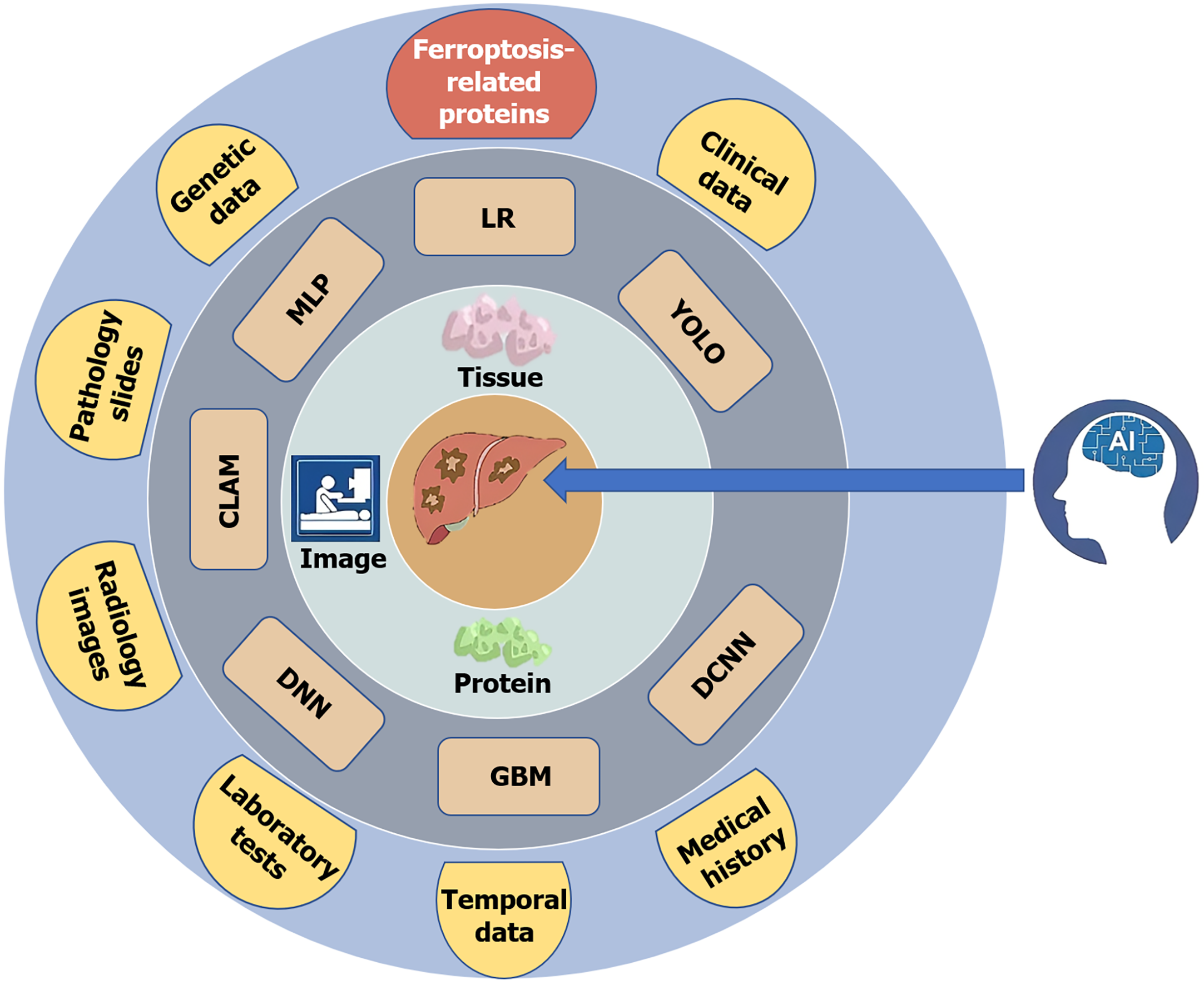 Commonly used algorithms include deep neural network, gradient boosting machine, deep convolutional neural network, you only look once, logistic regression, multilayer perceptron, and compressed linear approximation model. During model training, data are mainly drawn from eight sources: Genetic data, pathology slides, radiology images, laboratory tests, temporal data, medical history, clinical data, and ferroptosis-related proteins. LR: Logistic regression; YOLO: You only look once; DCNN: Deep convolutional neural network; GBM: Gradient boosting machine; DNN: Deep neural network; CLAM: Compressed linear approximation model; MLP: Multilayer perceptron; AI: Artificial intelligence.
