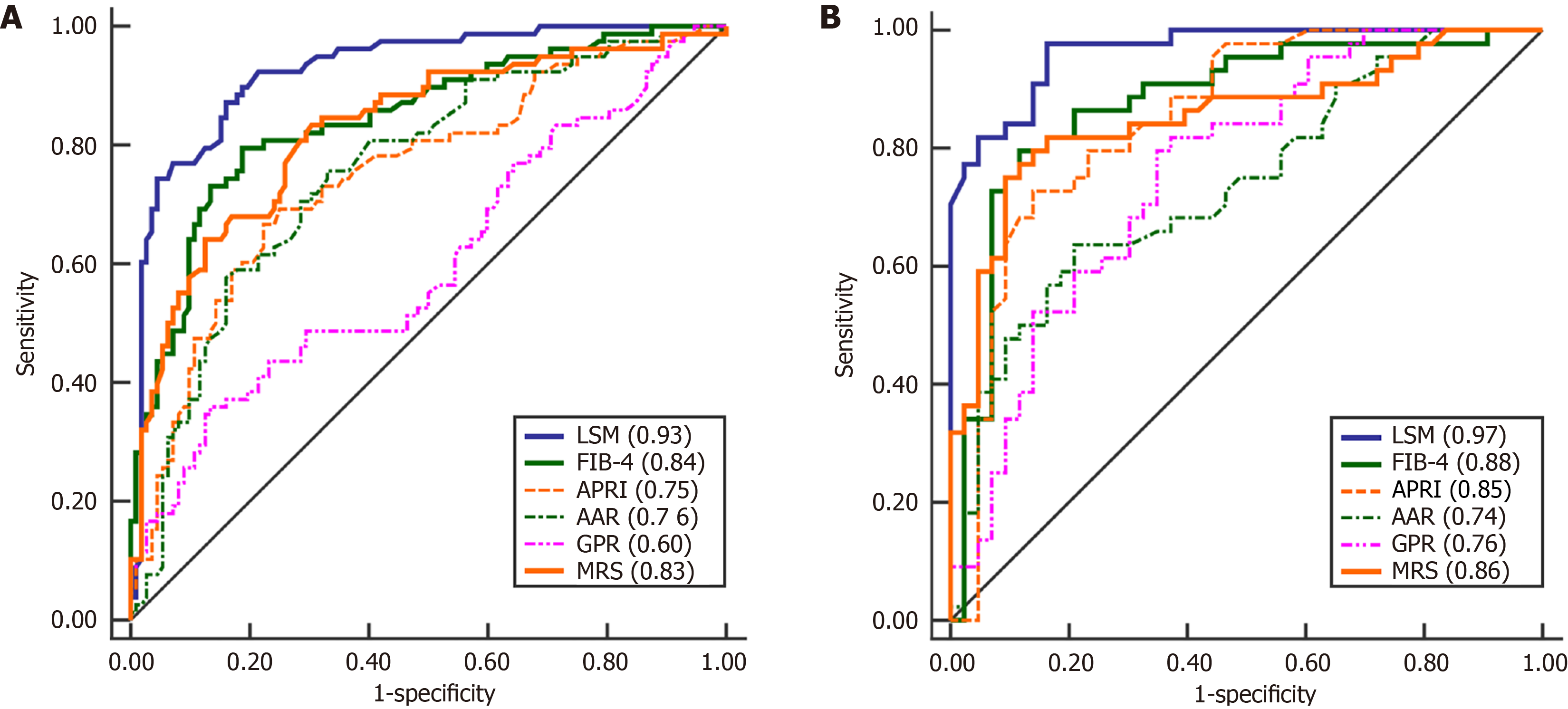 A: Advanced stage in the derivation group; B: Advanced stage in the validation group. LSM: Liver stiffness measurement; FIB-4: Fibrosis-4; APRI: Aspartate aminotransferase to platelet ratio index; AAR: Alanine aminotransferase ratio; GPR: Gamma-glutamyl transpeptidase to platelet ratio; MRS: Mayo risk score.