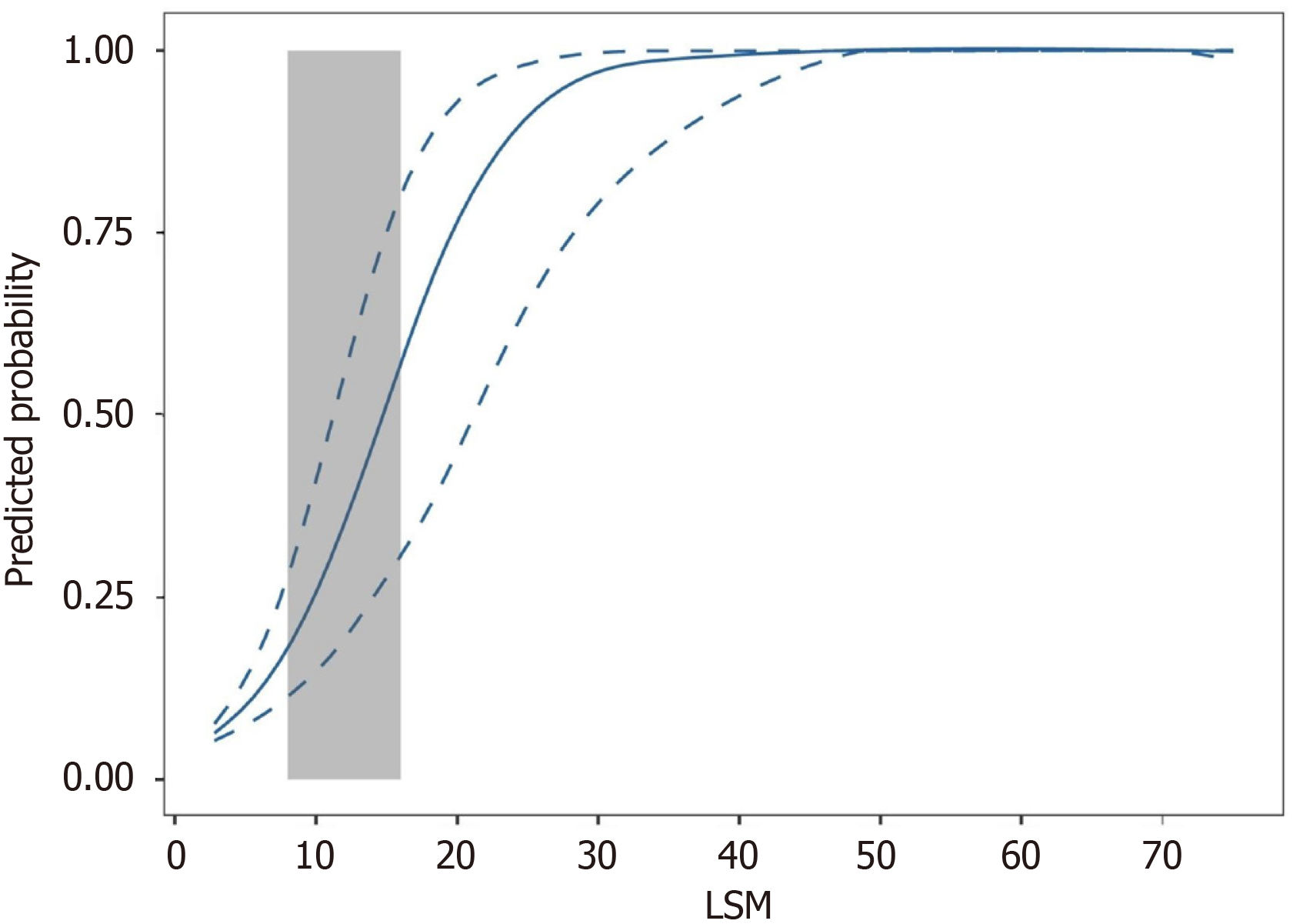 The grey area (8-16 kPa) highlights the portion of the curve in which vibration-controlled transient elastography may not be reliable in predicting advanced fibrosis. LSM: Liver stiffness measurement.