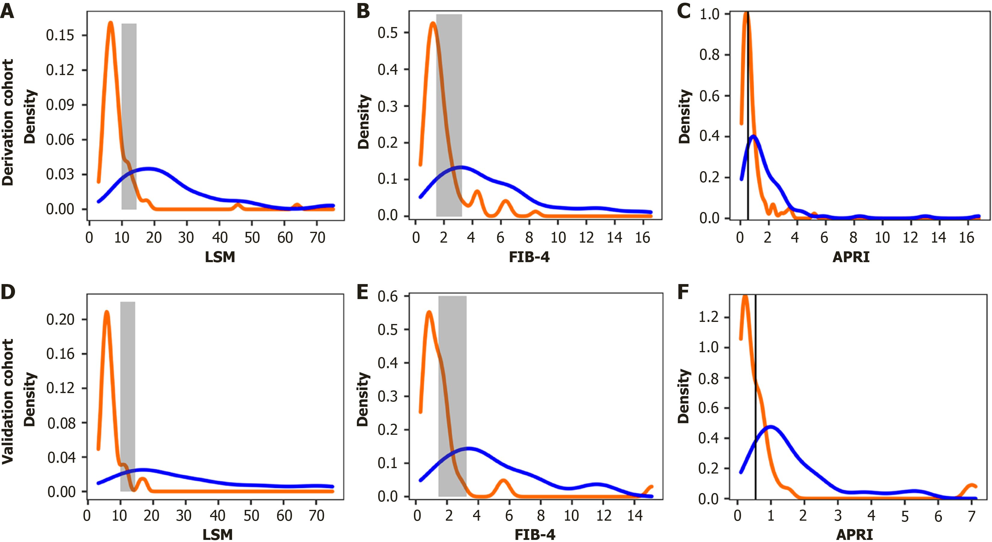 Patients with Ludwig stage I and II at liver biopsy are represented in red lines, those with Ludwig stage III and IV in blue lines. A-F: In the liver stiffness measurement (LSM) density plot (A and D), the grey area highlights the interval of LSM in which transient elastography is not reliable. The grey area in the fibrosis-4 (FIB-4) density plot (B and E) expresses the range of LSM in FIB-4 as proposed by Sterling et al[16]. The black straight line in the APRI score density plot (C and F) expresses the cut-off of 0.54 validated in primary biliary cholangitis[17]. LSM: Liver stiffness measurement; FIB-4: Fibrosis-4; APRI: Aspartate aminotransferase to platelet ratio index.