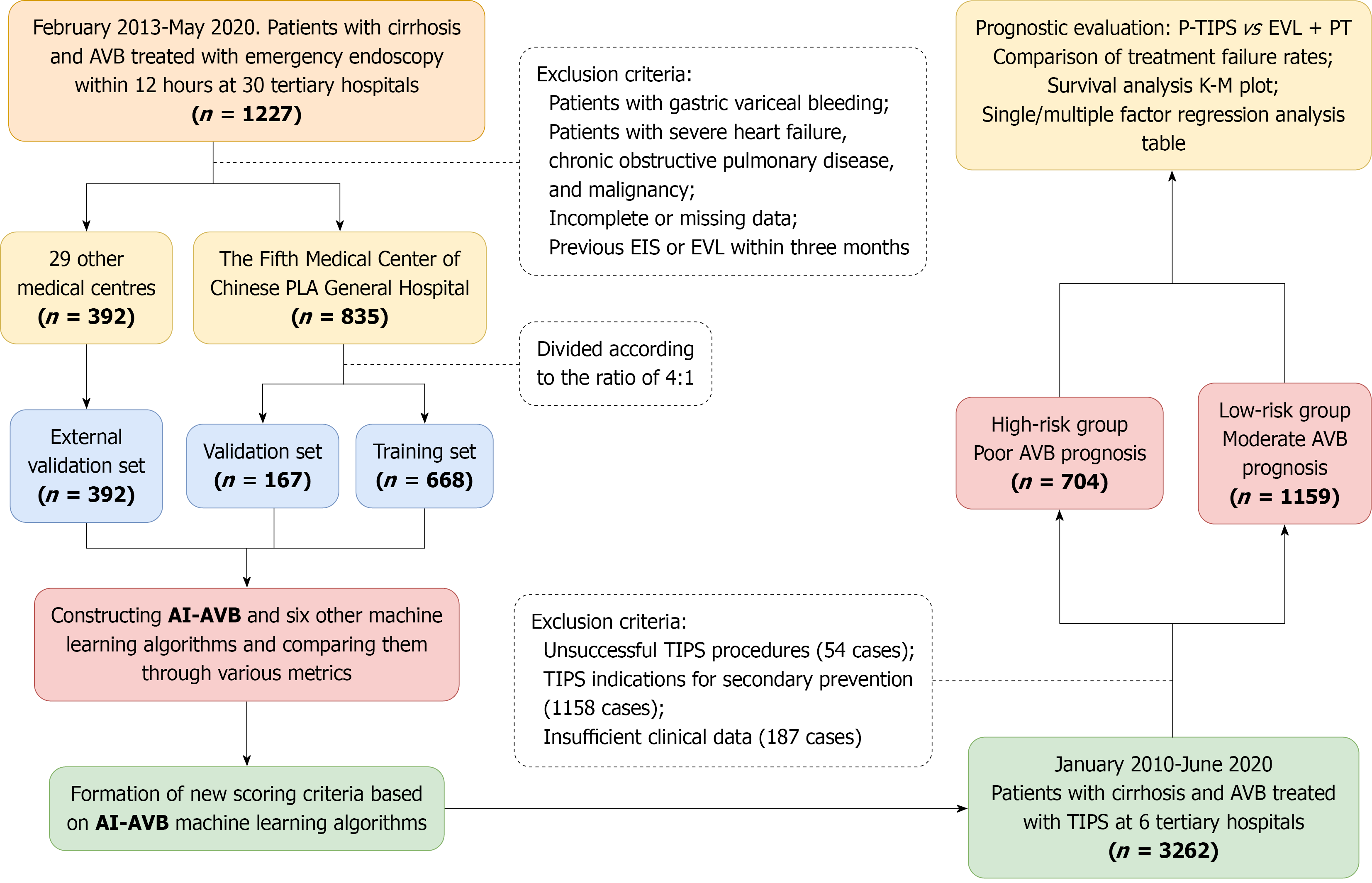 AVB: Acute variceal bleeding; AI: Artificial intelligence; EIS: Endoscopic injection sclerotherapy; EVL: Endoscopic variceal ligation; TIPS: Transjugular intrahepatic portosystemic shunt; p-TIPS: Preemptive transjugular intrahepatic portosystemic shunt; PT: Pharmacotherapy.