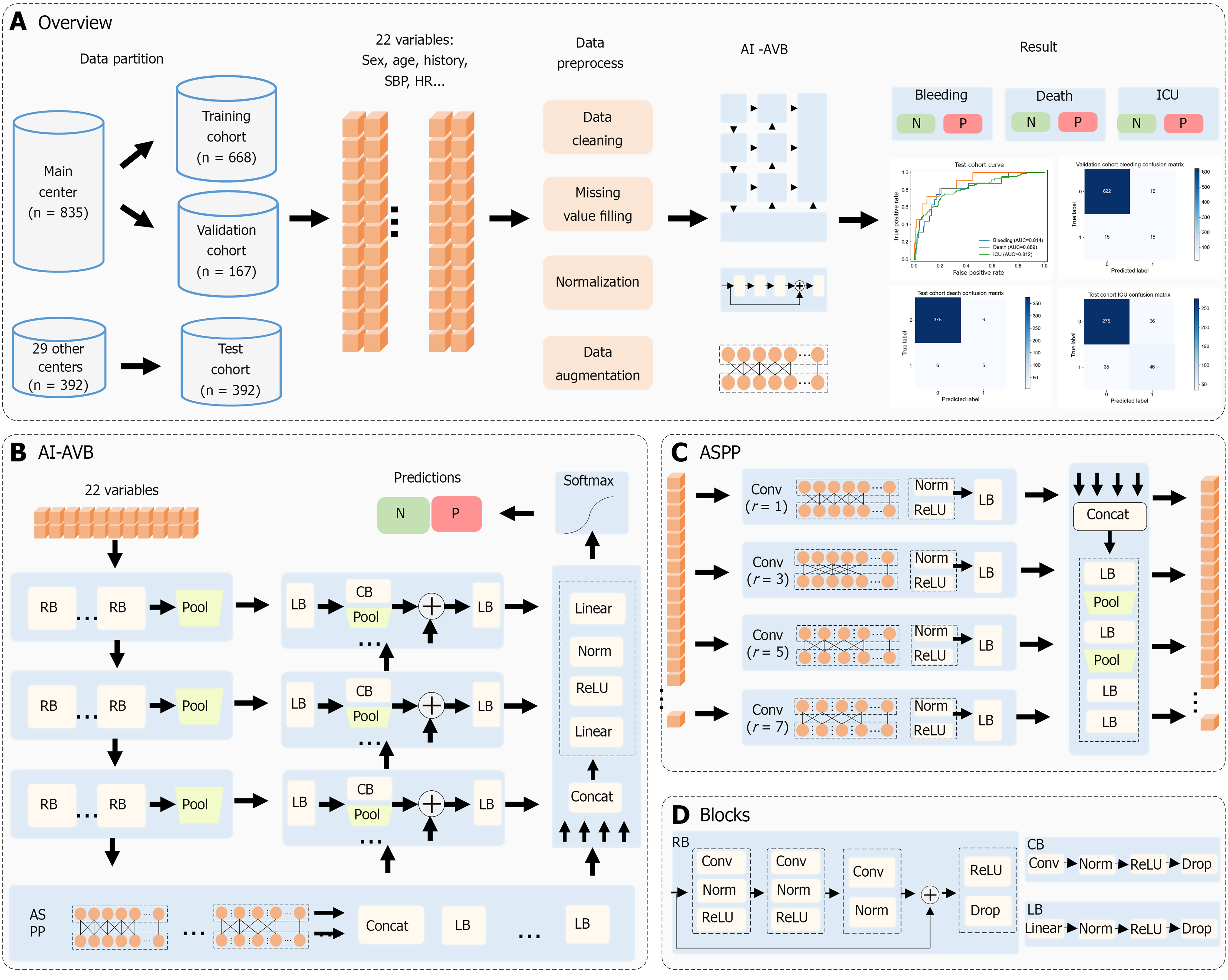 A: Overview of the prediction pipeline; B: Architecture of artificial intelligence-acute variceal bleeding; C: Architecture of atrous spatial pyramid pooling; D: Architecture of blocks. SBP: Systolic blood pressure; HR: Heart rate; AVB: Acute variceal bleeding; AI: Artificial intelligence; P: Positive; N: Negative; ICU: Intensive care unit; AUC: Area under the curve; RB: Residual block; CB: Convolution block; LB: Linear block; ASPP: Atrous spatial pyramid pooling; ReLU: Rectified linear unit; Conv: Convolution; Norm: Normalization; Drop: Dropout.