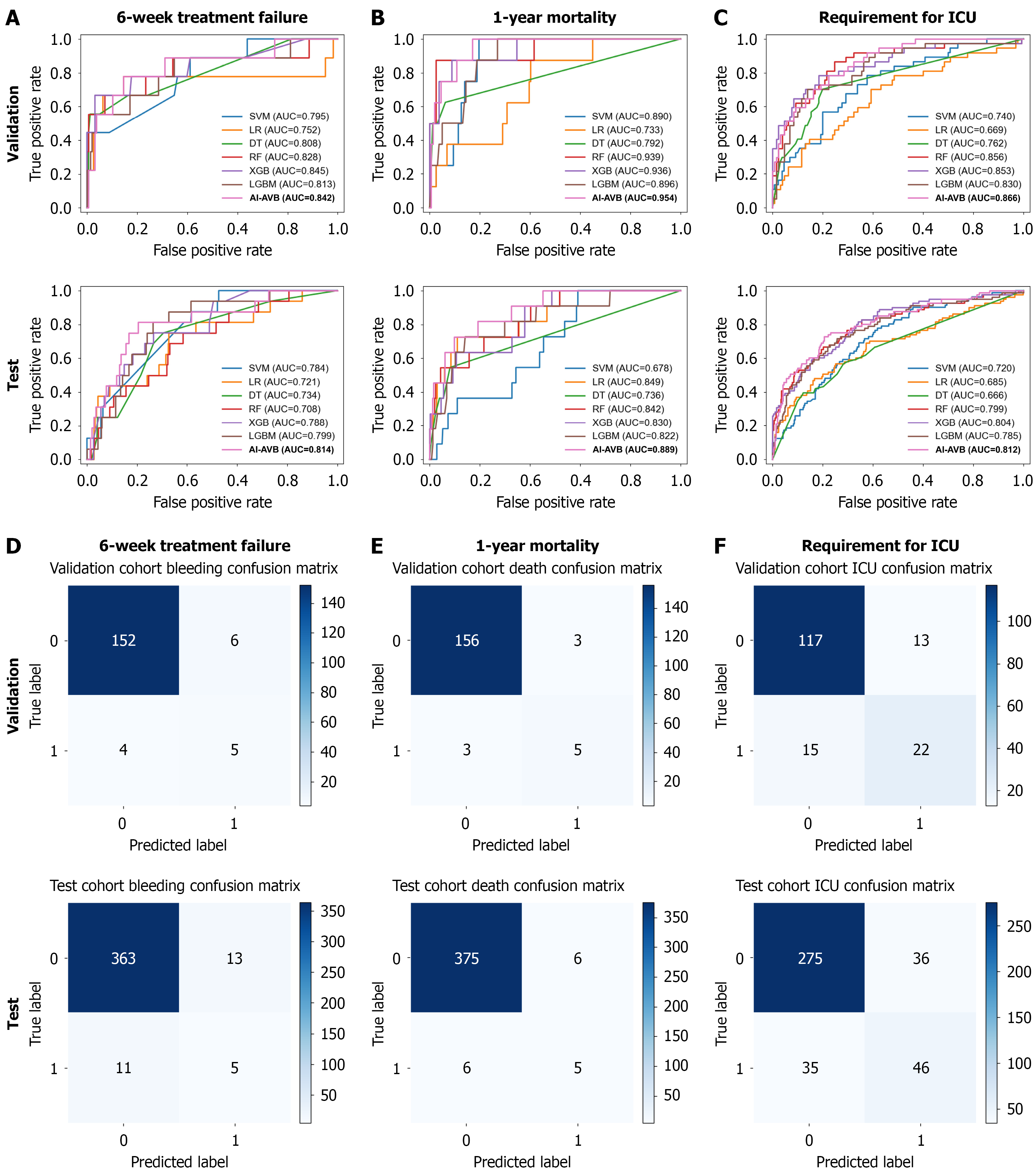 A-C: Receiver operating characteristic curves of seven models for 6-week treatment failure, 1-year mortality, intensive care unit (ICU) requirement, respectively, in the internal and external validation cohort; D-F: Confusion matrix for 6-week treatment failure, 1-year mortality, ICU requirement, respectively, in the internal and external validation cohort using artificial intelligence-acute variceal bleeding algorithms. True labels on the vertical axis and predicted labels on the horizontal axis. ICU: Intensive care unit; AUC: Area under the curve; SVM: Support vector machine; LR: Logistic regression; DT: Decision tree; RF: Random forest; XGB: Extreme gradient boosting; LGBM: Light gradient boosting machine; AVB: Acute variceal bleeding; AI: Artificial intelligence.