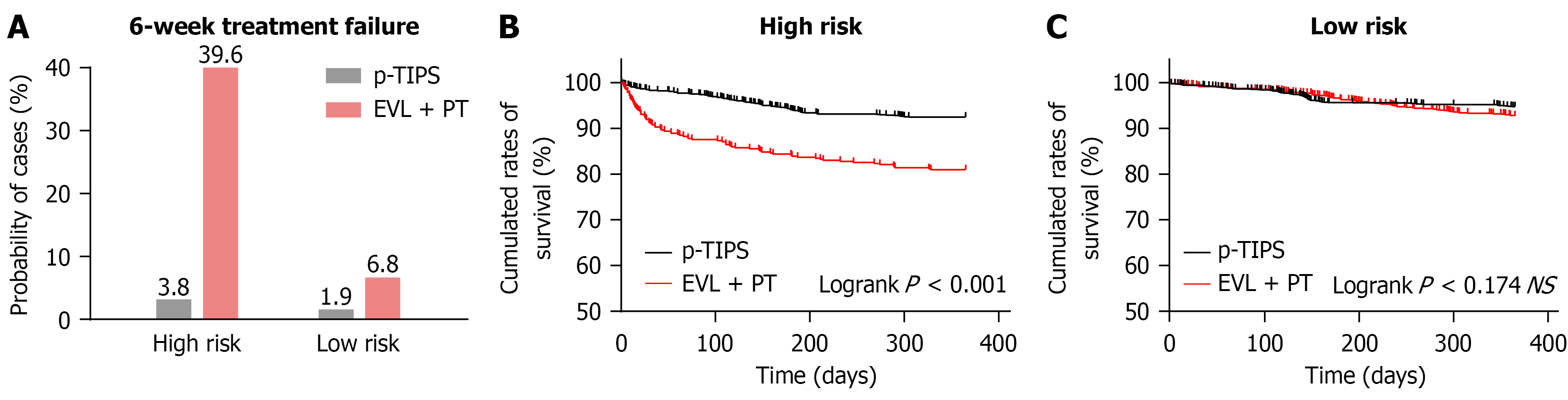 A: 6-week treatment failure in high or low-risk patients; B and C: 1-year survival rates in high and low risk patients. EVL: Endoscopic variceal ligation; p-TIPS: Preemptive transjugular intrahepatic portosystemic shunt; PT: Pharmacotherapy.