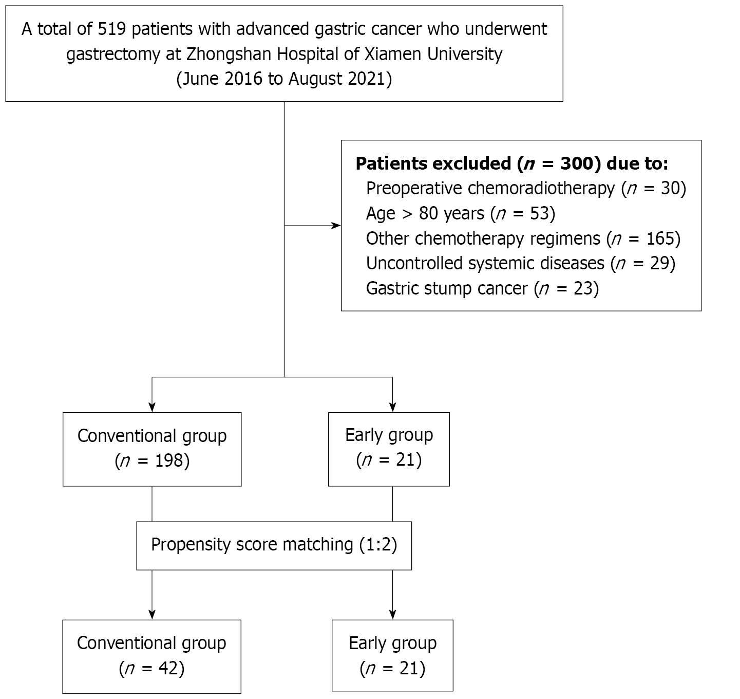 - Citation: Lin L, Zhang P, Wang YY, Cai YF, Wen LB, Chen WP, Xiao YF, Li ZK, Liu GY. Early vs conventional initiation of adjuvant chemotherapy in advanced gastric cancer: A propensity-matched outcomes study. World J Gastroenterol 2025; 31(42): 110069