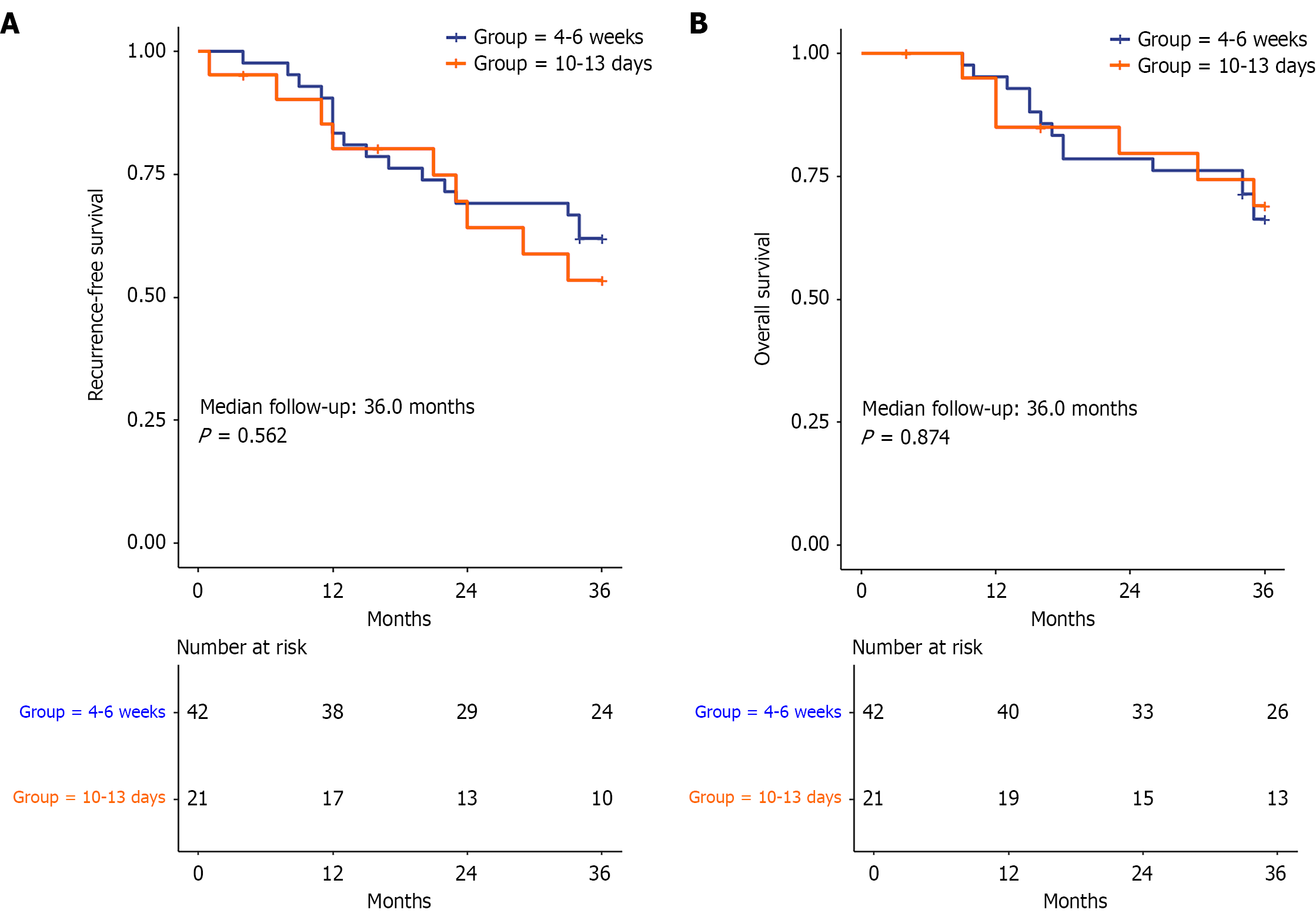A: Recurrence-free survival curves for patients in the early and conventional groups; B: Overall survival curves for patients in the early and conventional groups.