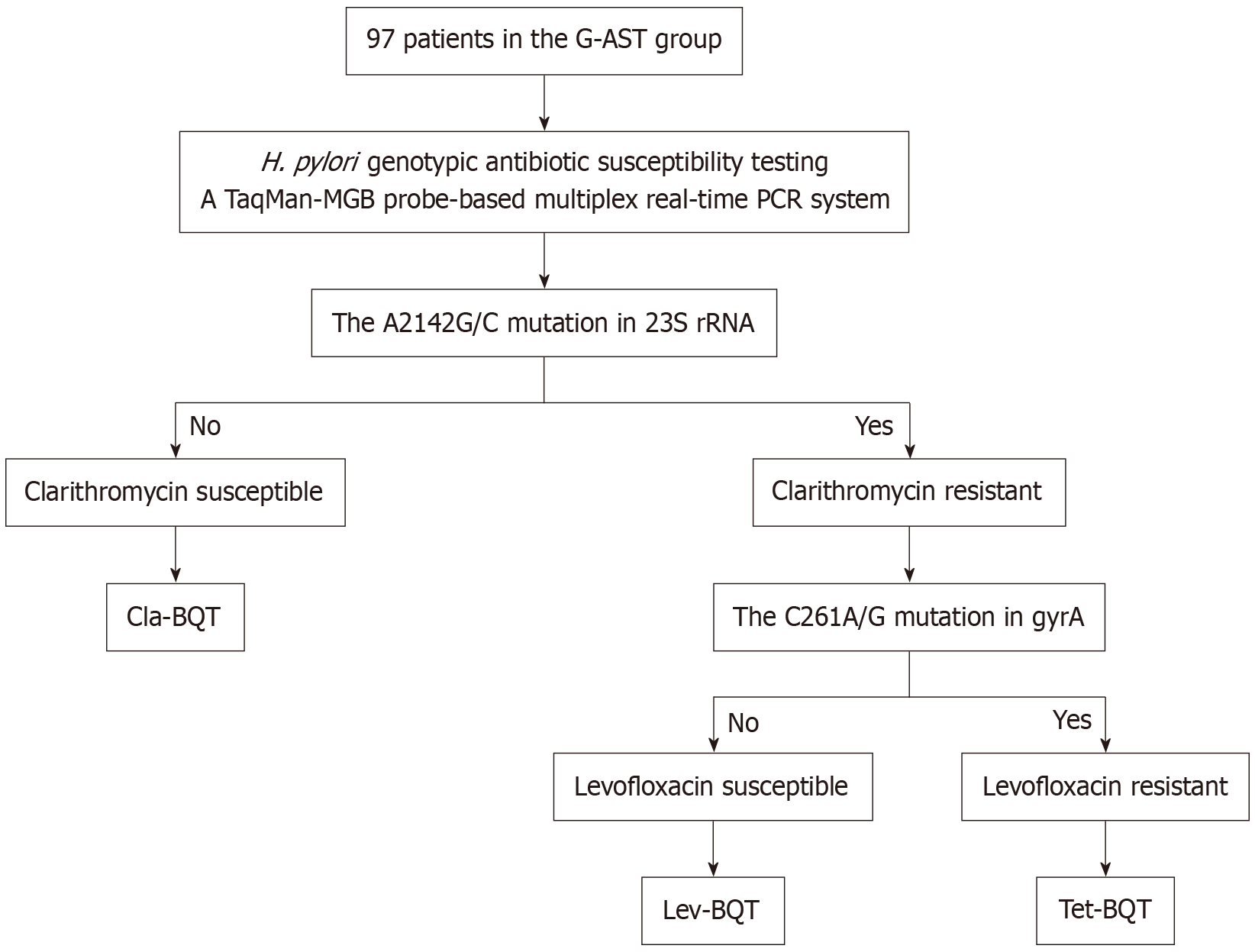 Treatment was tailored as clarithromycin-containing bismuth quadruple therapy (BQT), levofloxacin-containing BQT, or tetracycline-containing BQT according to clarithromycin and levofloxacin resistance. H. pylori: Helicobacter pylori; PCR: Polymerase chain reaction; Cla-BQT: Clarithromycin-containing bismuth quadruple therapy; Lev-BQT: Levofloxacin-containing bismuth quadruple therapy; Tet-BQT: Tetracycline-containing bismuth quadruple therapy.