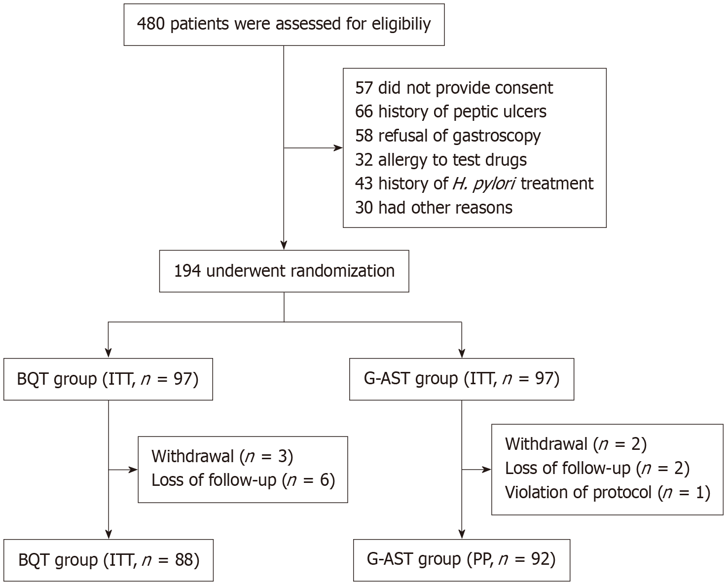 H. pylori: Helicobacter pylori; ITT: Intention-to-treat analysis; PP: Per-protocol analysis; G-AST: Genotypic antibiotic susceptibility testing; BQT: Bismuth quadruple therapy.