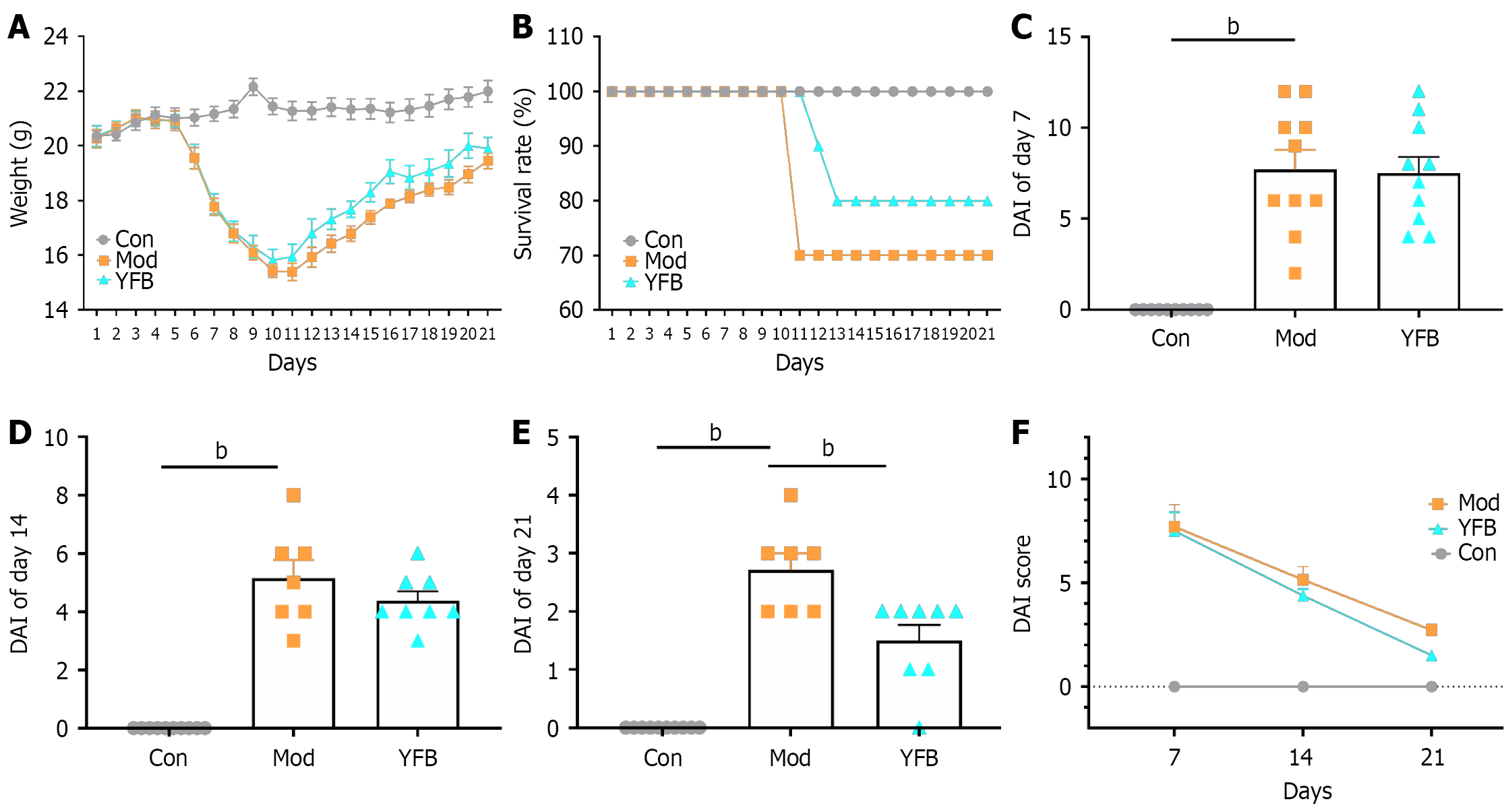 A: Effects of Yiyi Fuzi Baijiang powder on body weight of mice with ulcerative colitis-induced during the 21-day monitoring period; B: Survival rate from different groups during the 21-day monitoring period; C: Disease activity index (DAI) score of mice in different groups 7 days after dextran sulfate sodium (DSS) intervention; D: DAI score of mice in different groups 14 days after DSS intervention; E: DAI score of mice in different groups 21 days after DSS intervention; F: Colitis severity indicated by DAI score. bP < 0.01. Data are expressed as the mean ± SD, n = 7-10. Con: Control; Mod: Model; YFB: Yiyi Fuzi Baijiang powder; DAI: Disease activity index.
