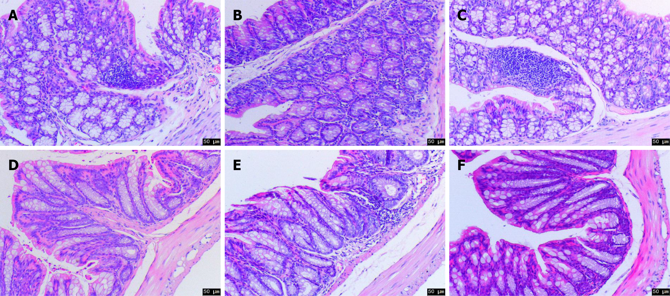 A: Histopathological performance of proximal colon in control group (50 μm); B: Histopathological performance of proximal colon in model group (50 μm); C: Histopathological performance of proximal colon in Yiyi Fuzi Baijiang (YFB) group (50 μm); D: Histopathological performance of distal colon in control group (50 μm); E: Histopathological performance of distal colon in model group (50 μm); F: Histopathological performance of distal colon in YFB group (50 μm), n = 7-10. YFB: Yiyi Fuzi Baijiang powder.