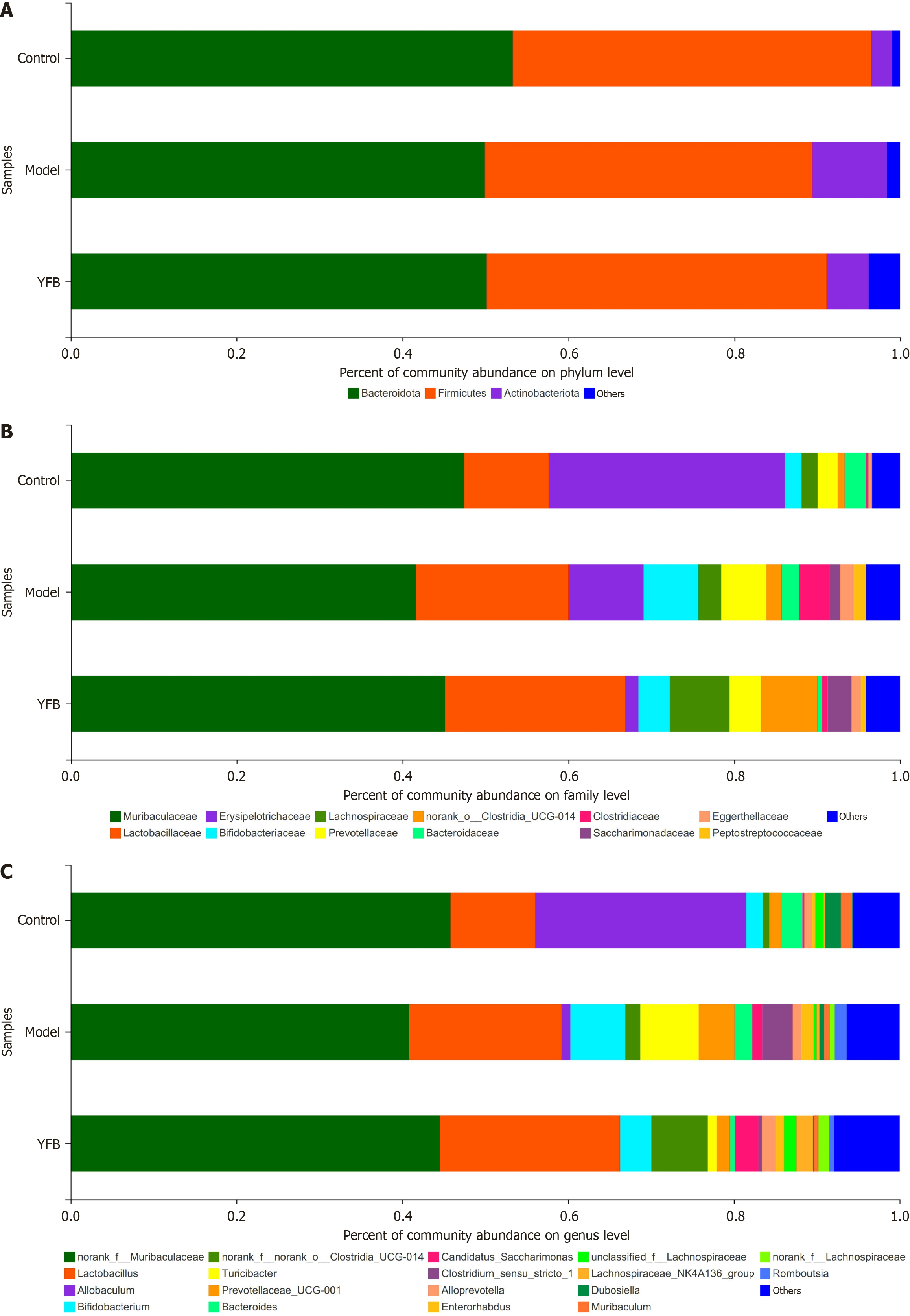 A: The species composition at the phylum level; B: The species composition at the family level; C: The species composition at the genus level. YFB: Yiyi Fuzi Baijiang powder.