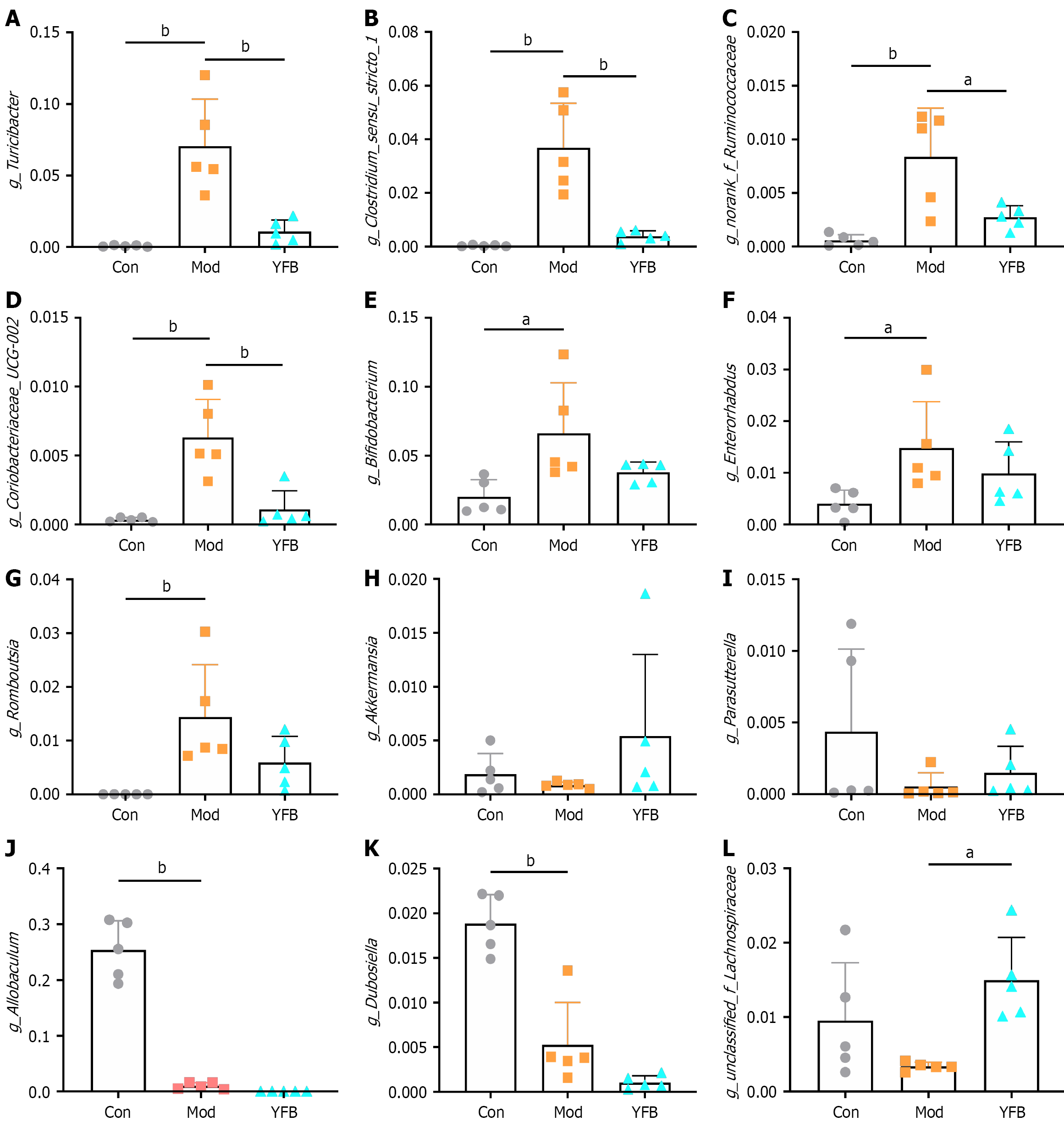 A: Relative abundance of g_Turicibacter; B: Relative abundance of g_Clostridium_sensu_stricto_1; C: Relative abundance of g_norank_f_Ruminococcaceae; D: Relative abundance of g_Coriobacteriaceae_UCG-002; E: Relative abundance of g_Bifidobacterium; F: Relative abundance of g_Enterorhabdus; G: Relative abundance of g_Romboutsia; H: Relative abundance of g_Akkermansia; I: Relative abundance of g_Parasutterella; J: Relative abundance of g_Allobaculum; K: Relative abundance of g_Dubosiella; L: Relative abundance of g_unclassified_f_Lachnospiraceae. Data are expressed as mean ± SD, n = 5 in each group. aP < 0.05. bP < 0.01. Con: Control; Mod: Model; YFB: Yiyi Fuzi Baijiang powder.