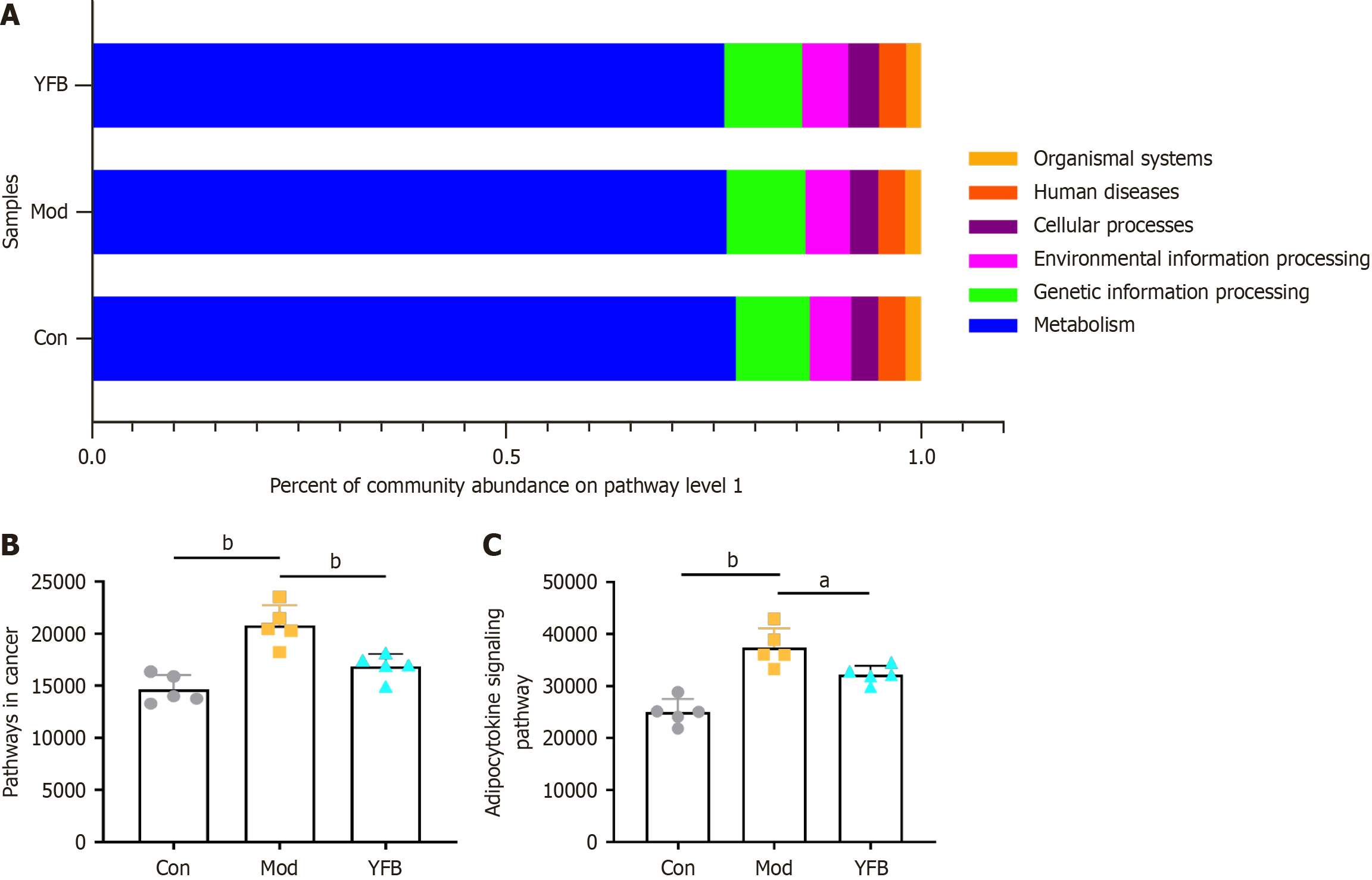 A: Kyoto Encyclopedia of Genes and Genomes function; B: Pathways in cancer; C: Adipocytokine signaling pathway. Data are expressed as mean ± SD, n = 5 in each group. aP < 0.05. bP < 0.01. Con: Control; Mod: Model; YFB: Yiyi Fuzi Baijiang powder.