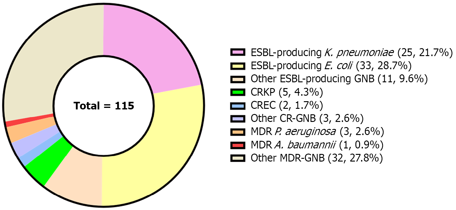 ESBL: Extended-spectrum β-lactamase; K. pneumoniae: Klebsiella pneumoniae; E. coli: Escherichia coli; GNB: Gram-negative bacteria; CRKP: Carbapenem-resistant Klebsiella pneumoniae; CREC: Carbapenem-resistant Enterobacter cloacae; CR-GNB: Carbapenem-resistant Gram-negative bacteria; P. aeruginosa: Pseudomonas aeruginosa; A. baumannii: Acinetobacter baumannii; MDR: Multidrug-resistant.