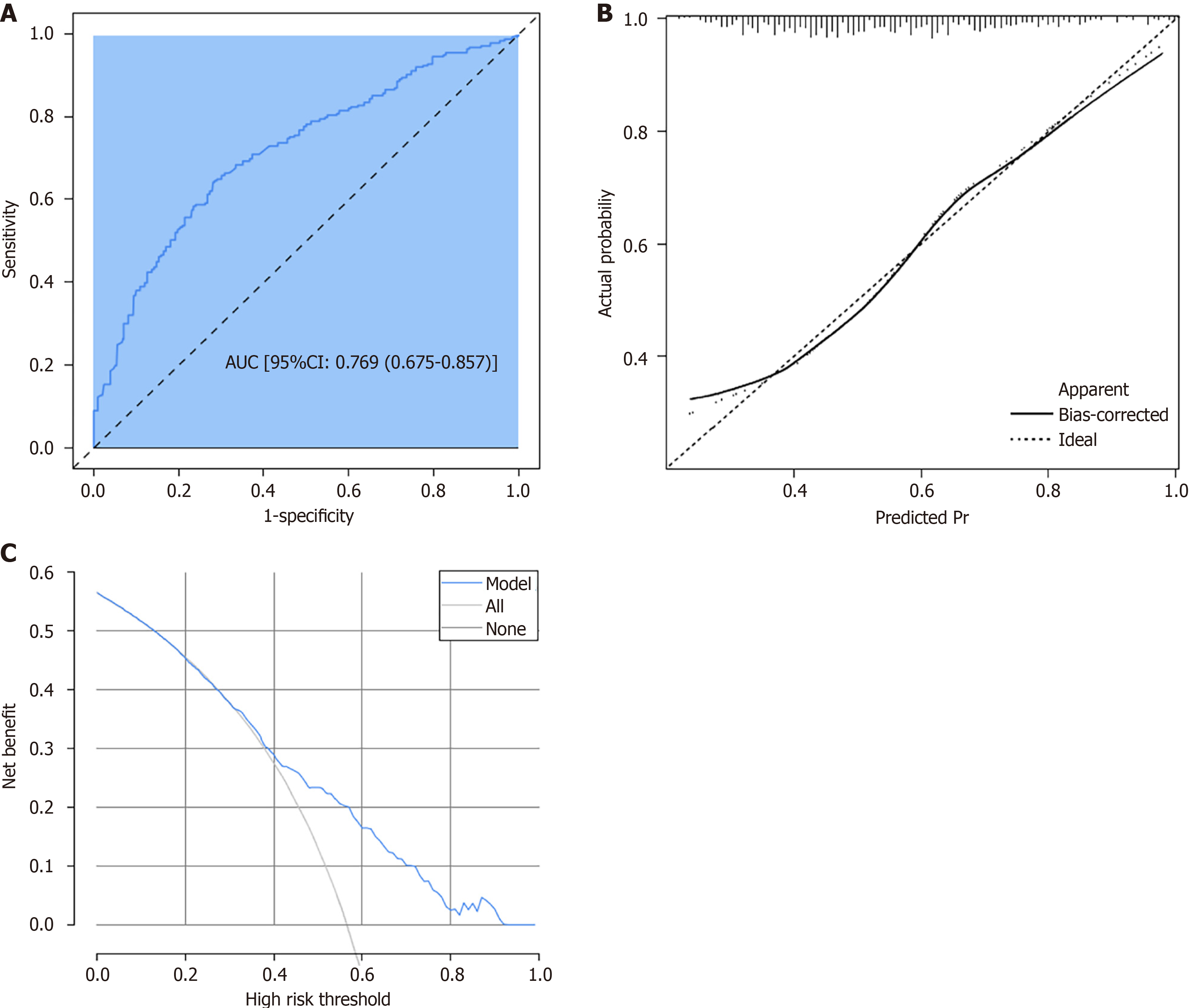 A: Receiver operating characteristic curve; B: Calibration curve; C: Decision curve analysis. AUC: Area under the curve; CI: Confidence interval; Pr: Probability.