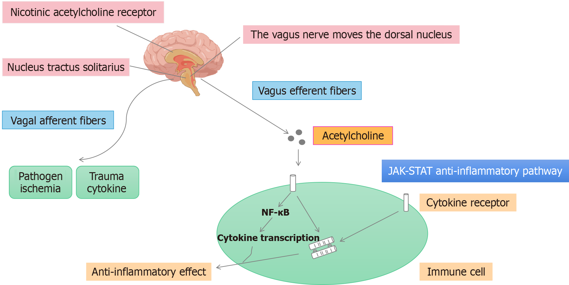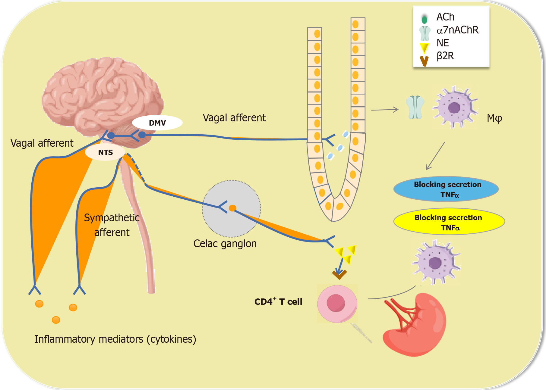 Mφs: Macrophages; Ach: Acetylcholine; α7nAChR: Α7 nicotinic acetylcholine receptor; TNF: Tumor necrosis factor α; NTS: Nucleus tractus solitarius.