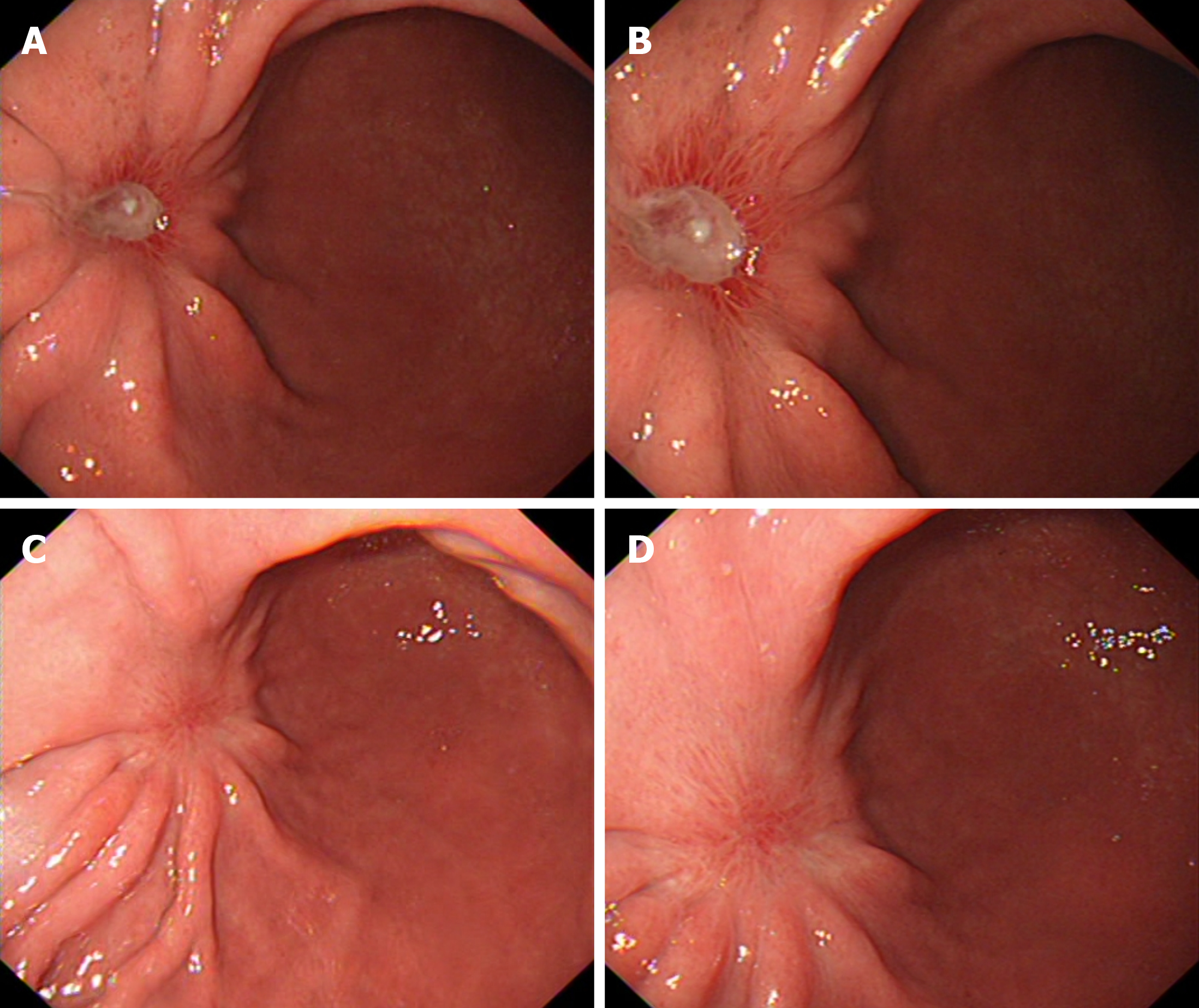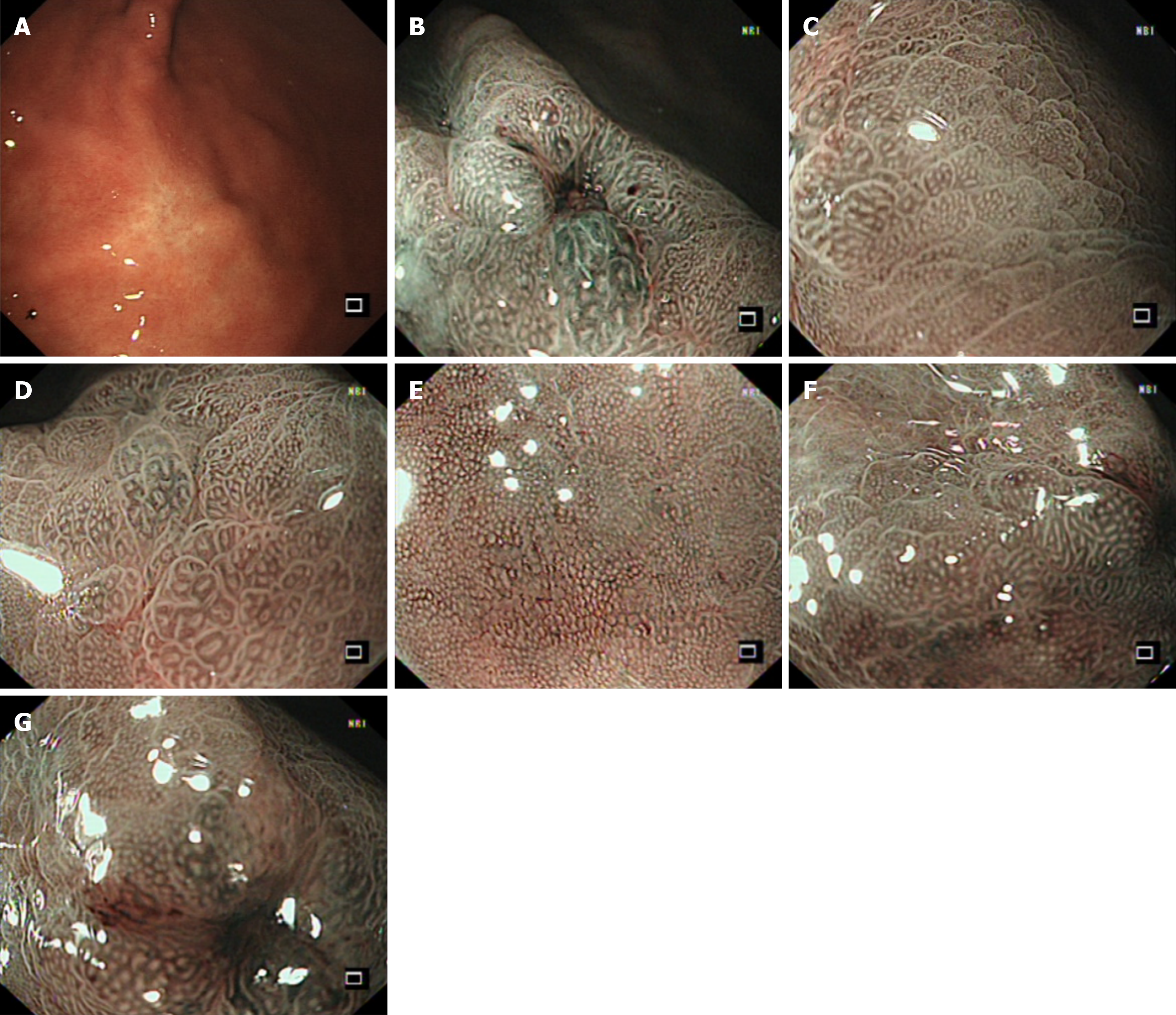 A: White light; B: Biopsy site [narrow-band imaging magnifying endoscopy (NBI-ME)]; C: Anal side of the lesion (NBI-ME); D: Greater curvature side of the lesion (NBI-ME); E: Oral side of the lesion (NBI-ME); F: Near the ulcer at the oral side of the lesion (NBI-ME); G: Anterior wall side of the lesion (NBI-ME).