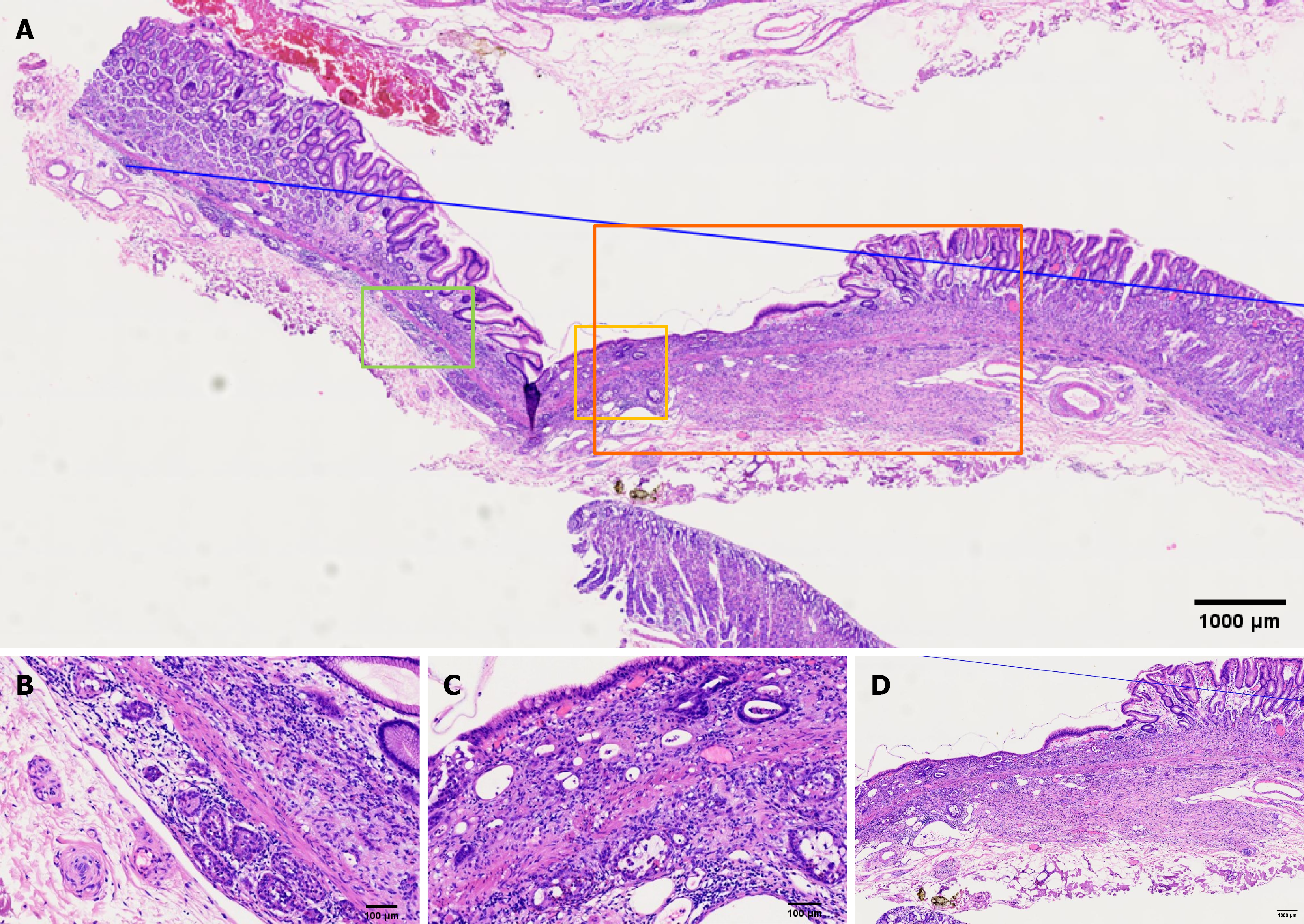 A: Pathological tissue strip #4 [hematoxylin and eosin (HE) 15 ×, scale bar = 1000 μm]; B: Green box: Nodular distribution of neuroendocrine tumor cells (HE 100 ×, scale bar = 100 μm); C: Yellow box: Signet-ring-like cell clusters with nested distribution (HE 100 ×, scale bar = 100 μm); D: Cord-like poorly differentiated adenocarcinoma infiltrating into submucosa (HE 15 ×, scale bar = 100 μm).