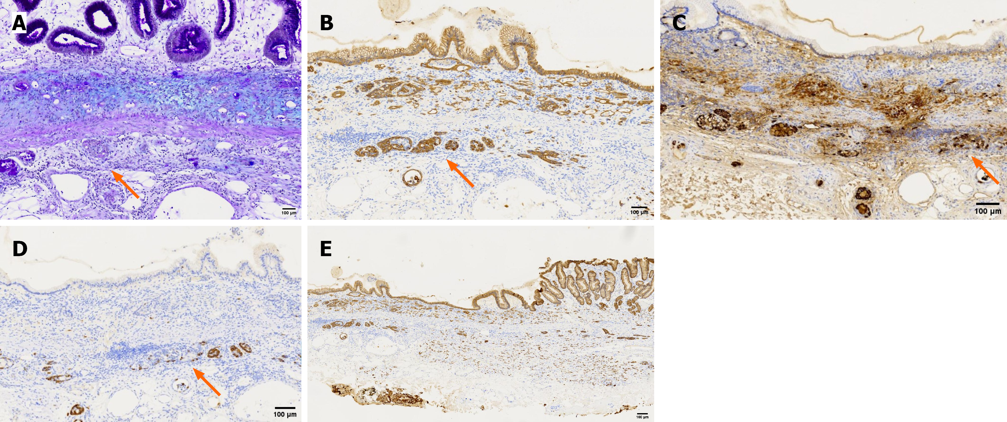All photograph magnifications are × 100. A: Periodic acid Schiff-alcian blue (amphicrine carcinoma area), scale bar = 100 μm; B: Cytokeratin pan (amphicrine carcinoma area), scale bar = 100 μm; C: Synaptophysin (amphicrine carcinoma area), scale bar = 100 μm; D: Chromogranin A (amphicrine carcinoma area), scale bar = 100 μm; E: Cytokeratin pan (poorly differentiated adenocarcinoma area), scale bar = 100 μm.