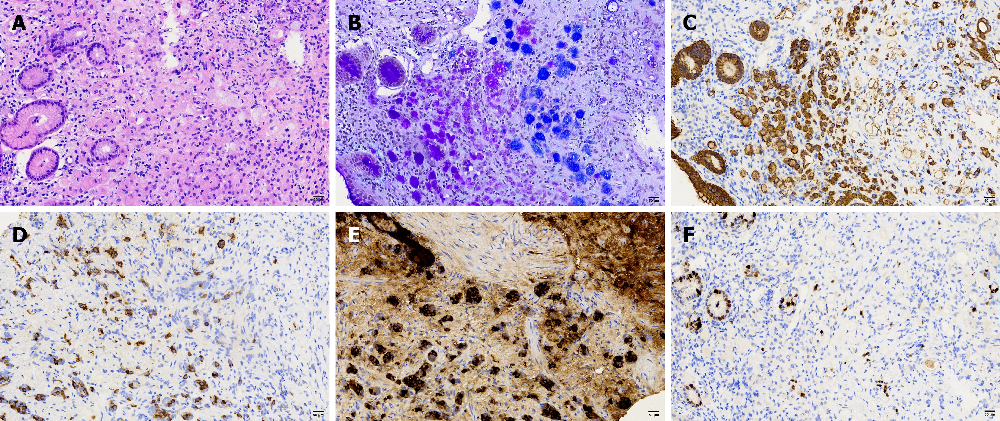 The magnifications of all photographs are × 200. A: Signet-ring cell carcinoma cells, scale bar = 100 μm; B: Periodic acid Schiff-alcian blue (+), scale bar = 100 μm; C: Cytokeratin pan, scale bar = 100 μm; D: Signet-ring cell carcinoma cells were positive for synaptophysin, scale bar = 100 μm; E: Chromogranin A (+), scale bar = 100 μm; F: Ki-67 low expression, scale bar = 100 μm.