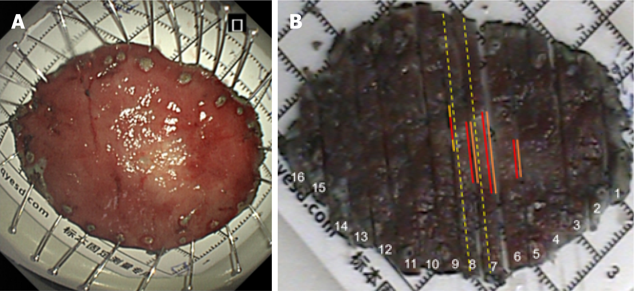 A: Endoscopic submucosal dissection specimen fixation; B: Yellow dashed line: Neuroendocrine tumor; yellow solid line: Amphicrine carcinoma; red solid line: Poorly differentiated adenocarcinoma; orange solid line: Signet-ring cell carcinoma.