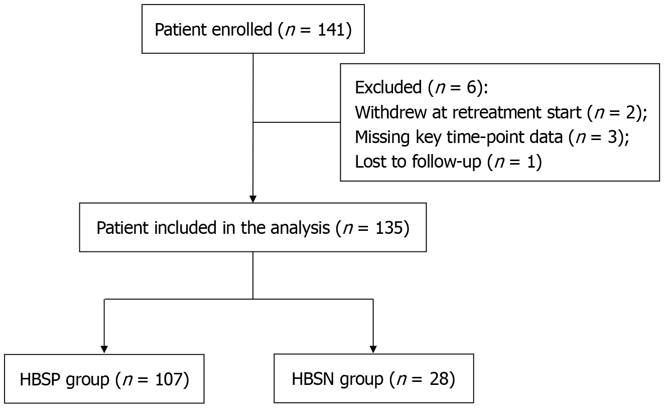 A total of 141 patients with chronic hepatitis B and compensated liver cirrhosis meeting inclusion criteria were initially enrolled. Six patients were excluded: 2 withdrew at the start of retreatment, 3 had missing key time-point data, and 1 was lost to follow-up. The remaining 135 patients were included in the final analysis and stratified by hepatitis B surface antigen (HBsAg) serostatus: 107 in the HBsAg-positive group and 28 in the HBsAg-negative group. Arrows indicate the progression through enrollment, exclusion, and final group allocation. HBSP: Hepatitis B surface antigen positive; HBSN: Hepatitis B surface antigen negative.