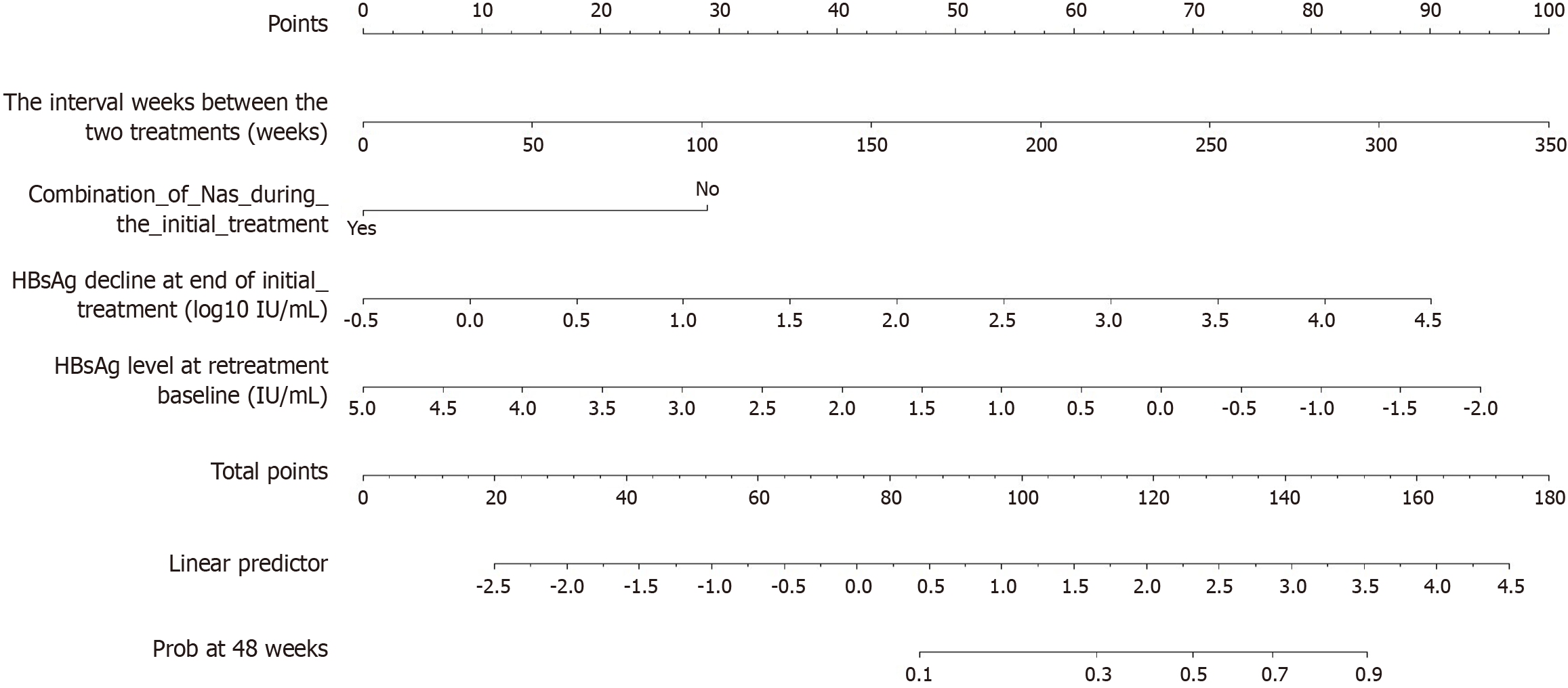 Figure 2 Nomogram for predicting hepatitis B surface antigen clearance after retreatment.