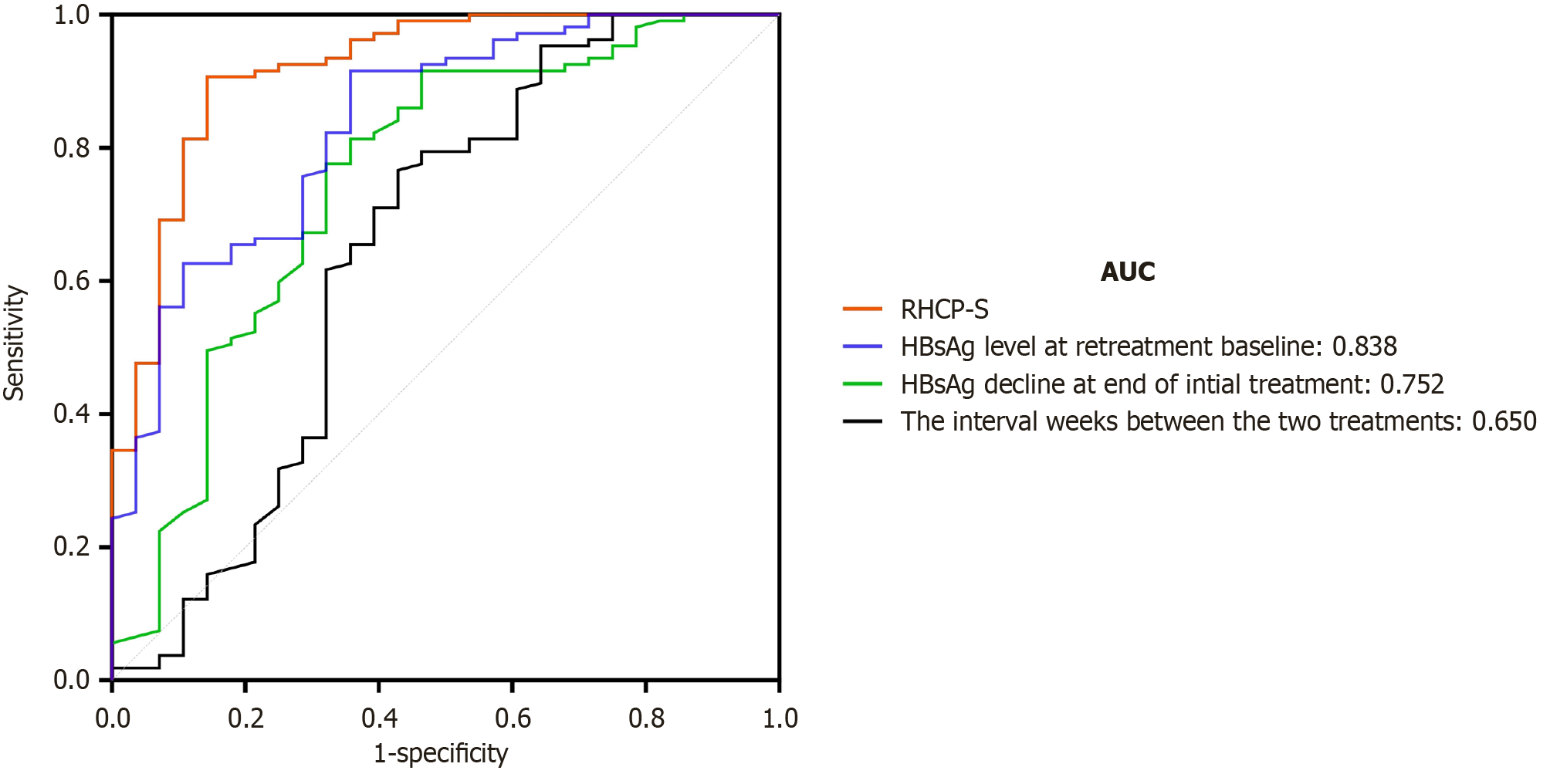 Comparison of the retreatment hepatitis B surface antigen (HBsAg) clearance prediction score (RHCP-S) model vs individual predictors shows superior discrimination for HBsAg clearance [area under the curve (AUC) = 0.920]. Curve comparisons: RHCP-S (red solid line) > retreatment baseline HBsAg (AUC = 0.838, blue solid line) > initial HBsAg decline (AUC = 0.752, green solid line) > treatment interval (AUC = 0.650, black solid line). AUC: Area under curve; HBsAg: Hepatitis B surface antigen; RHCP-S: Retreatment hepatitis B surface antigen clearance prediction score.