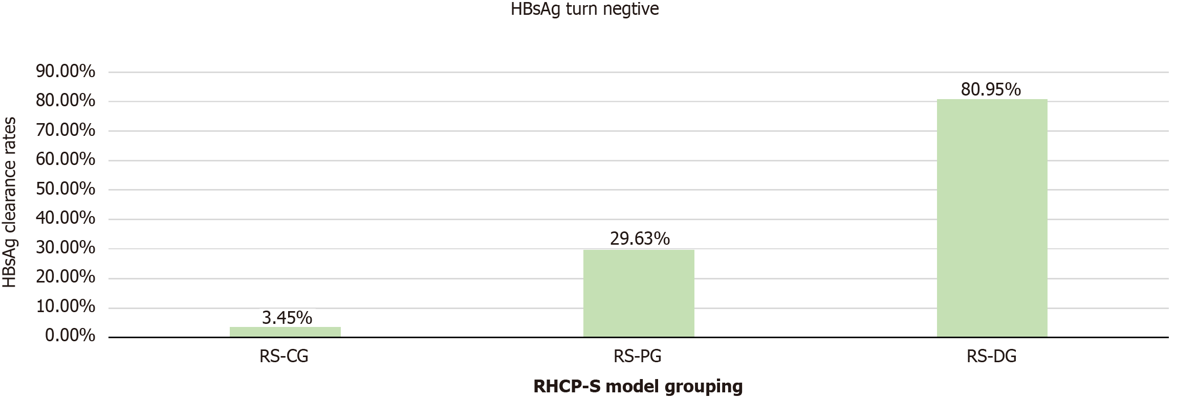 Patients were categorized using optimal cutoffs (74 and 110): Retreatment hepatitis B surface antigen clearance prediction score (RHCP-S) challenge group (< 74, clearance 3.45%); RHCP-S probable group (74-110, 29.63%), and RHCP-S dominant group (≥ 110, 80.95%). Bar heights represent cumulative clearance rates, demonstrating significant gradient efficacy (P < 0.001). HBsAg: Hepatitis B surface antigen; RHCP-S: Retreatment hepatitis B surface antigen clearance prediction score; RS-CG: Retreatment hepatitis B surface antigen clearance prediction score-challenge group; RS-PG: Retreatment hepatitis B surface antigen clearance prediction score-probable group; RS-DG: Retreatment hepatitis B surface antigen clearance prediction score-dominant group.